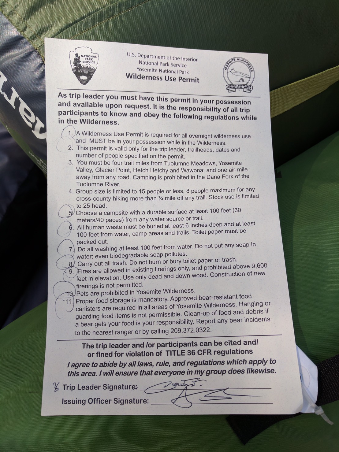 หลังจากเราติดต่อกับเจ้าหน้าที่ว่าเราจะ hiking กัน สิ่งที่เราต้องเตรียมให้เจ้าหน้าที่คือ เส้นทางการวางแผนที่เราจะเลือกเดิน และจุดหมายที่เราจะไป แล้วเจ้าหน้าที่จะให้ข้อมูลการปฎิบัติในการแคมป์ เช่น การตั้งแคมป์ให้ห่างจากทางเดิน 100 เมตร ห่างจากแม่น้ำ 100 เมตร รวมถึงสถานที่เหมาะสมในการตั้งแคมป์ และรายละเอียดอื่นๆให้เราปฏิบัติตาม พร้อมกับถังขยะสีดำดูปิดมิดชิดขนาดแขนข้างเดียวโอบ ไม่มีหูหิ้ว พร้อมกับต้องเสียเงิน 5$ เป็นค่าถังขยะ