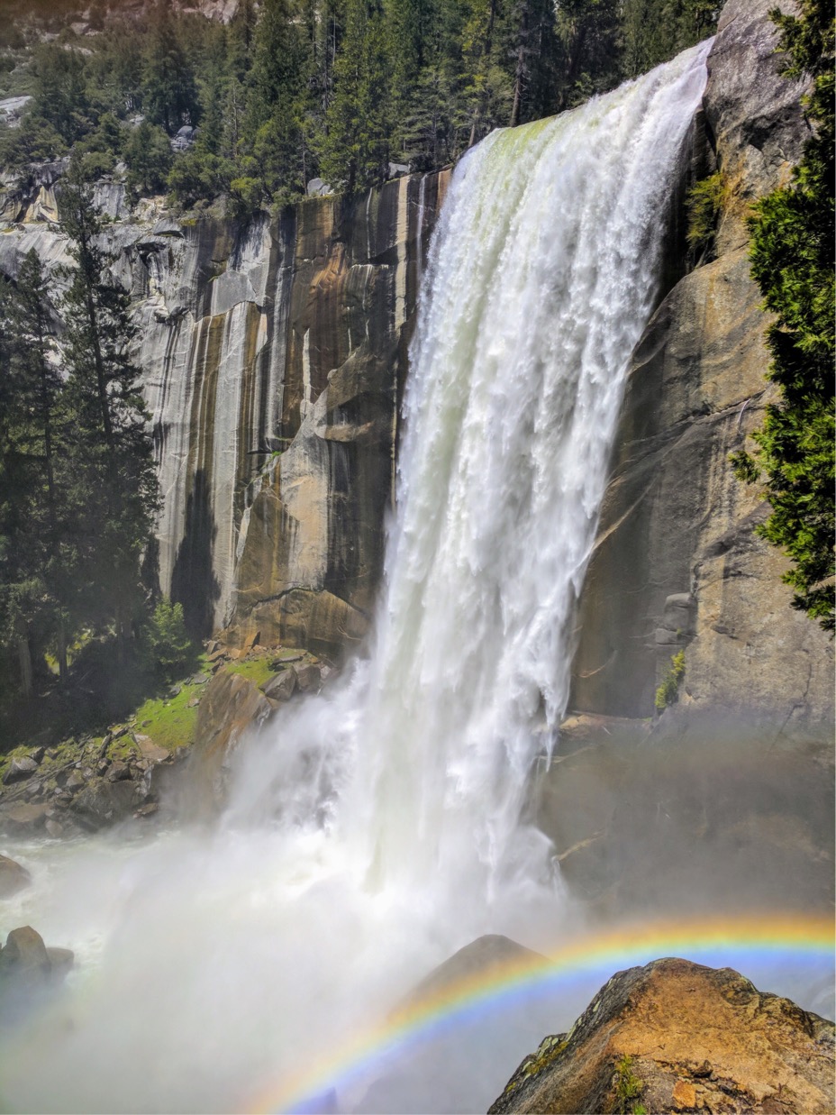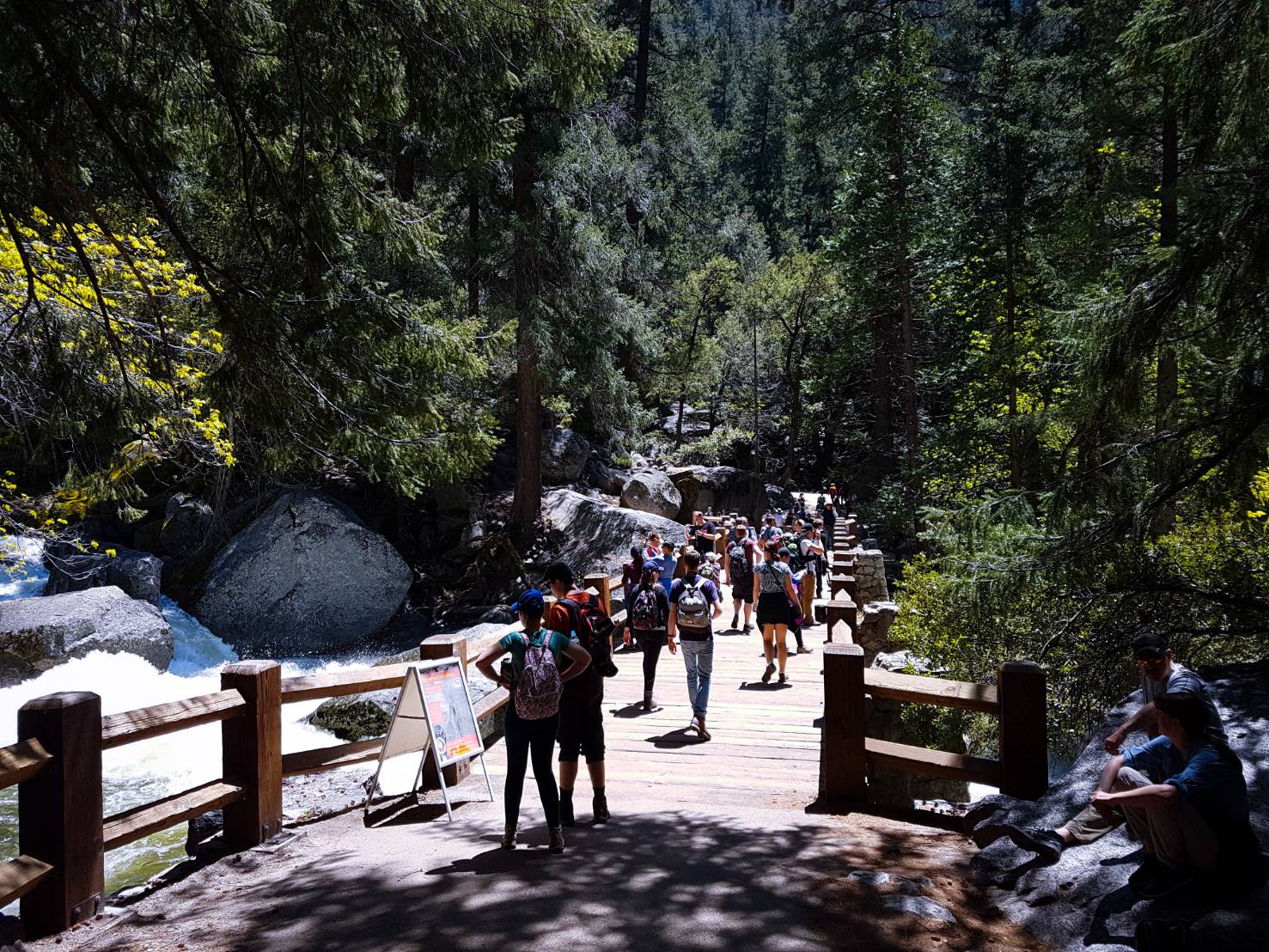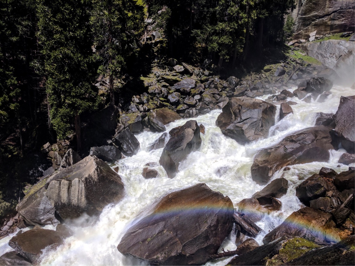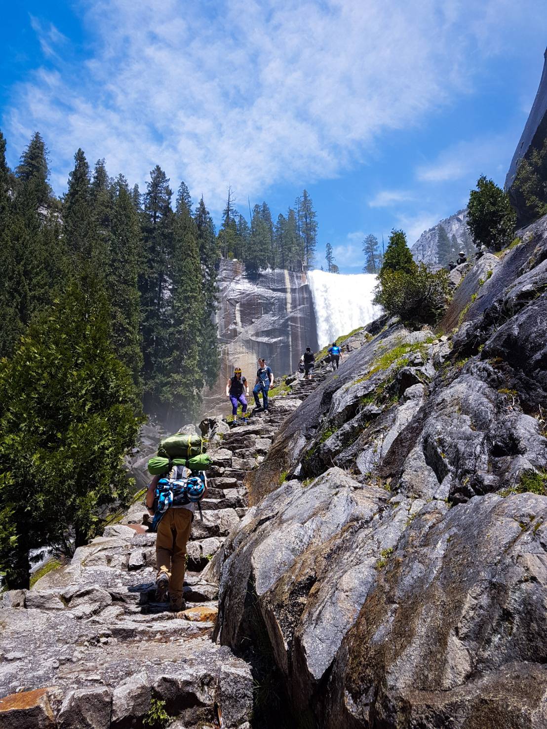 หลักจากนั้นเราต้องเลาะทางเดินที่ติดกับหน้าผาประมาณหนึ่งศอกเพื่อขึ้นไปบนยอดของ vernal fall เพื่อพักกลางวัน ตรงนี้ทุกคนสามารถพักผ่อนได้เพราะมีห้องน้ำไว้ให้บริการในระยะไม่ห่าง