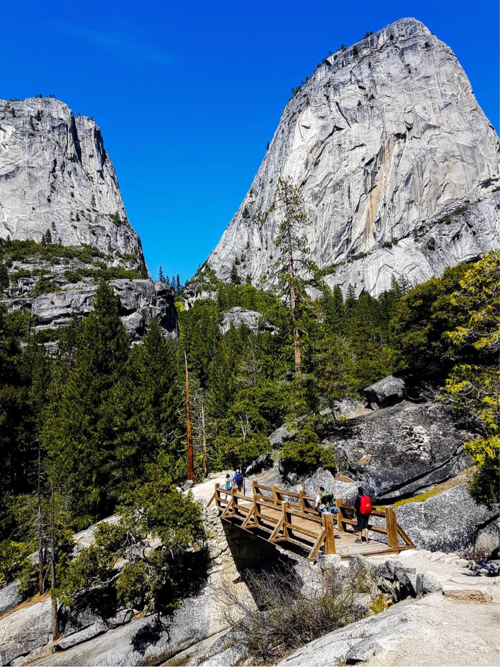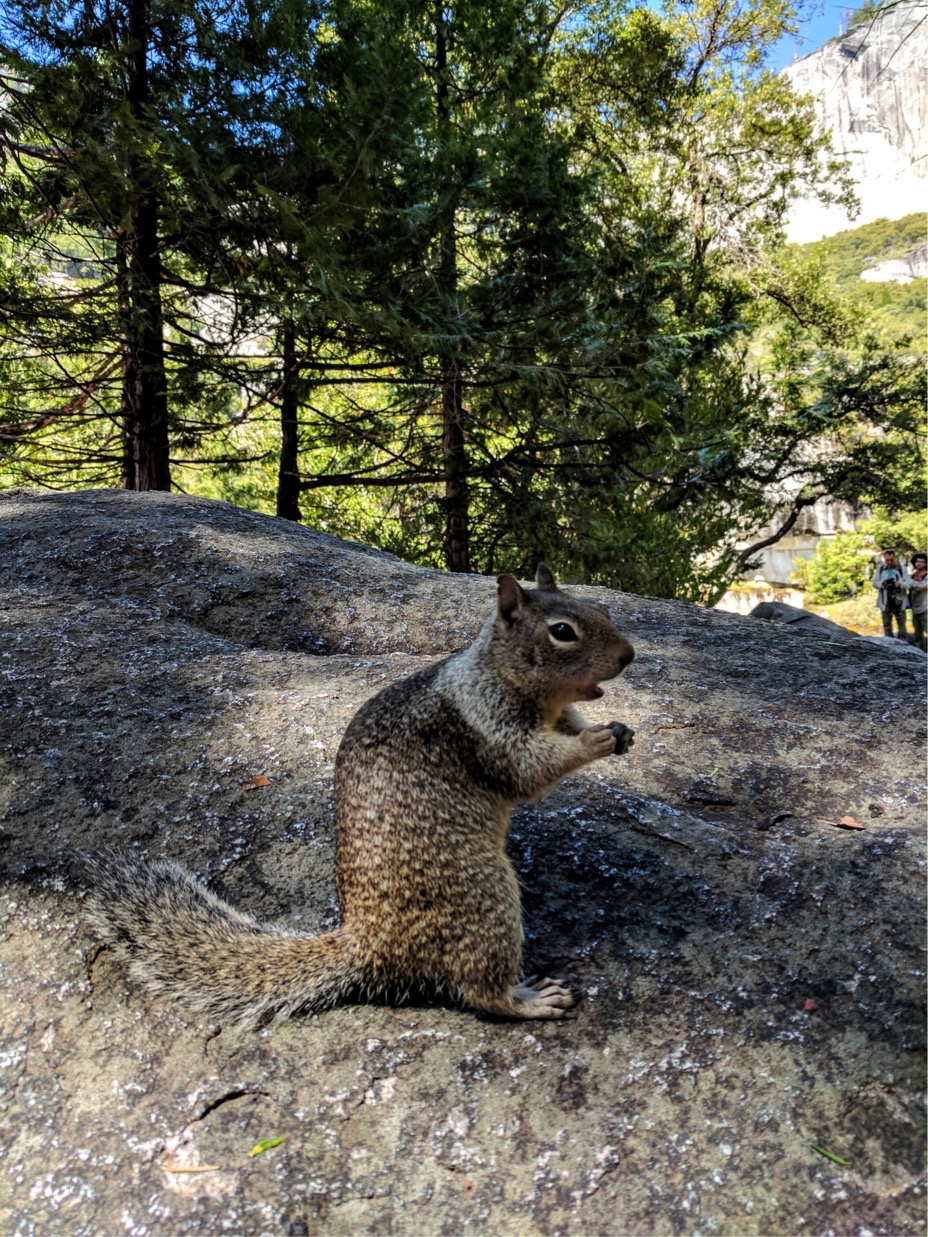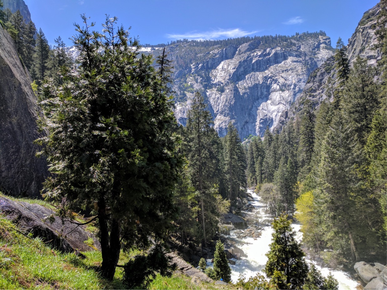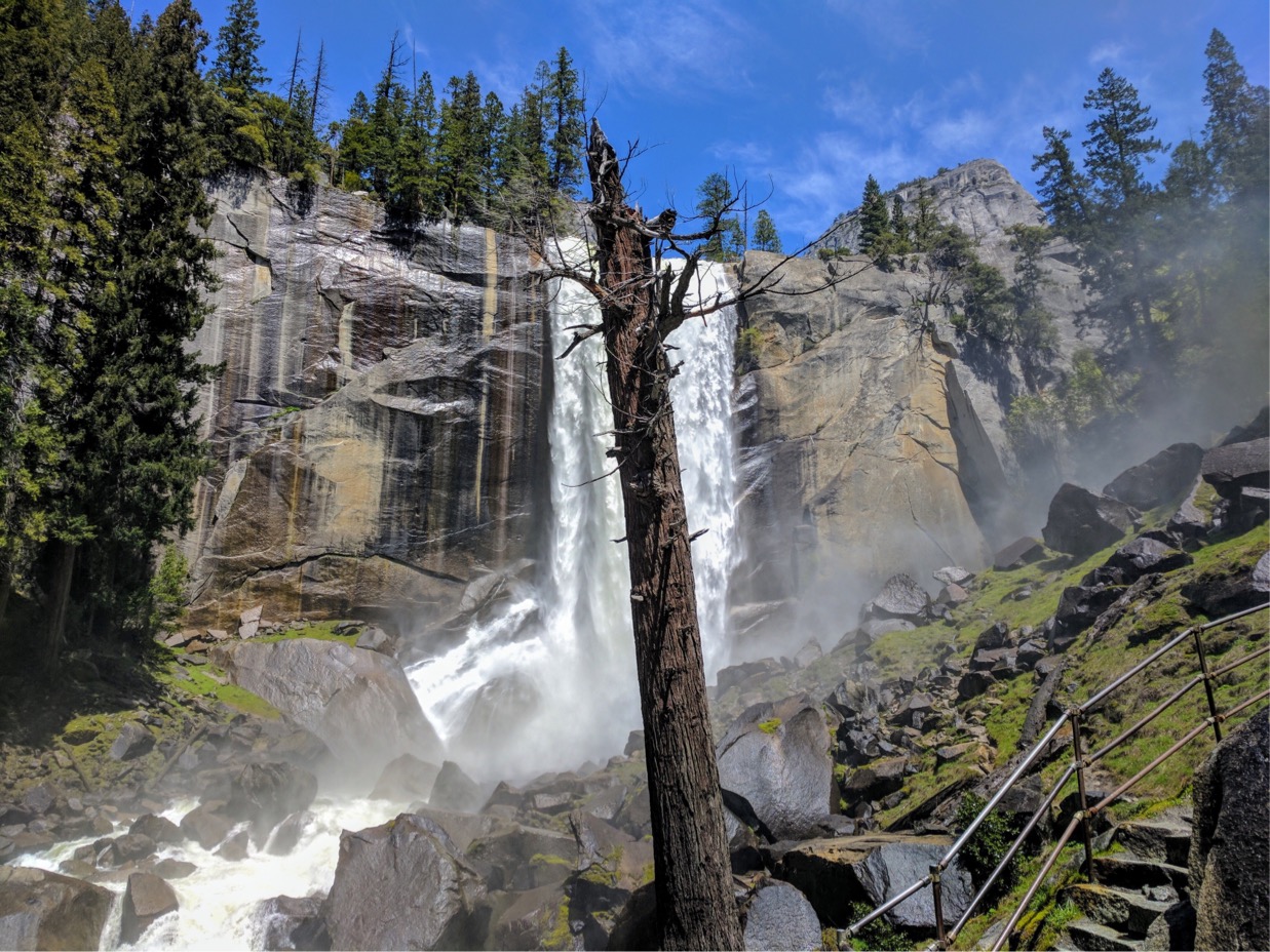 หลักจากนั้นเราต้องเลาะทางเดินที่ติดกับหน้าผาประมาณหนึ่งศอกเพื่อขึ้นไปบนยอดของ vernal fall เพื่อพักกลางวัน ตรงนี้ทุกคนสามารถพักผ่อนได้เพราะมีห้องน้ำไว้ให้บริการในระยะไม่ห่าง