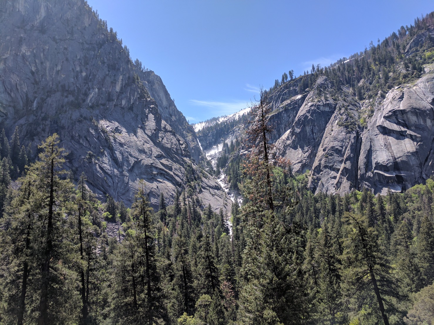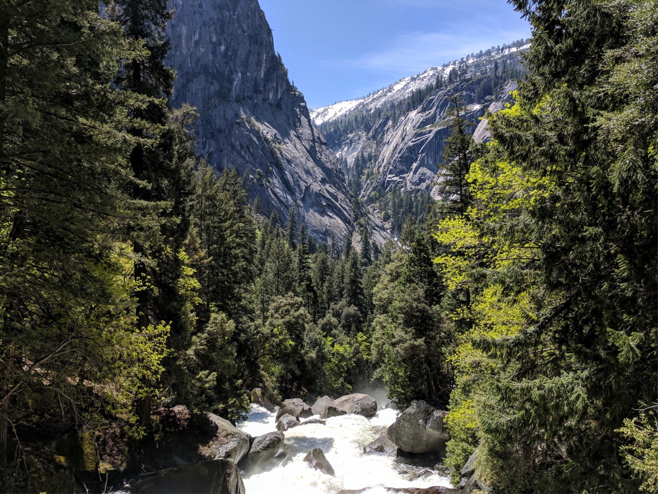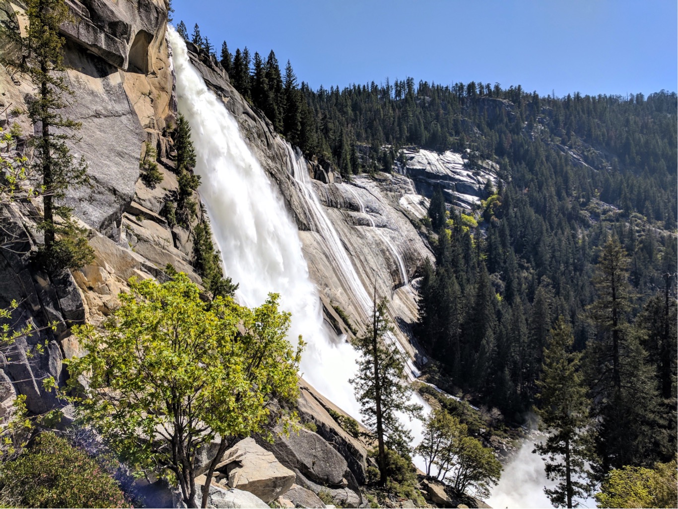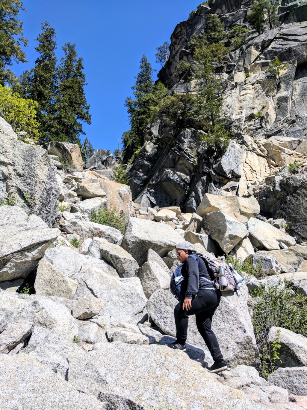 หลักจากนั้นเราต้องเลาะทางเดินที่ติดกับหน้าผาประมาณหนึ่งศอกเพื่อขึ้นไปบนยอดของ vernal fall เพื่อพักกลางวัน ตรงนี้ทุกคนสามารถพักผ่อนได้เพราะมีห้องน้ำไว้ให้บริการในระยะไม่ห่าง