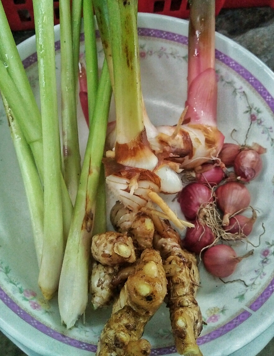 1. ตำขิง ข่า ตะไคร้ หอมแดง และตามด้วยกะปิ ลงไปให้เข้ากัน