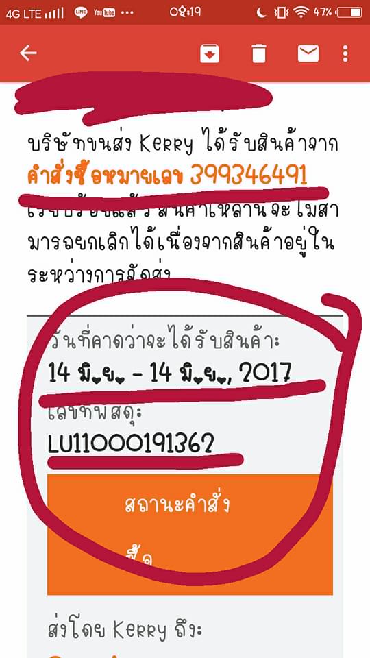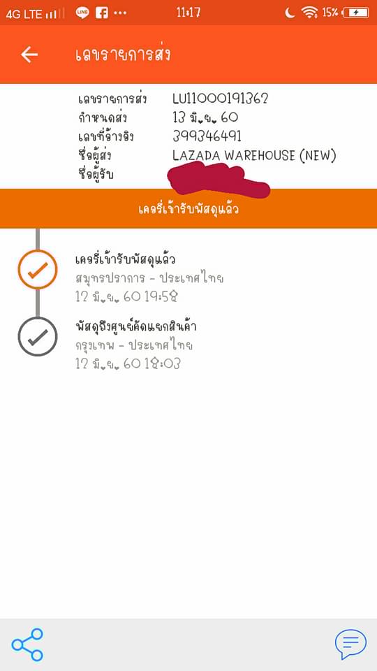 สั่งสินค้า Lazada 2019/06/04 ร้านส่ง 2019/06/05 เช็คสถานะ Tracking Page 5 มิถุนายน 16:41 พัสดุถูกส่งมอบที่สถานีรับฝากสินค้า 16:05 สินค้าของท่านได้รับการบรรจุเรียบร้อยแล้วและอย