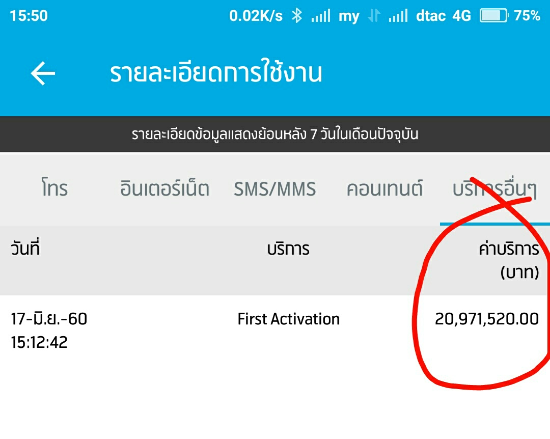 พอดีวันนี้ไปรับซิมฟรี ที่ dtac shop แบบว่าอยากใช้ go เพลินอะน่ะ แล้วมีเน็ตฟรี 500m ให้ใช้เลย หลังใช้ลงทะเบียนเสร็จแล้ว ลงแอปdtac เพื่อตรวจสอบการใช้งานดู พบว่ามีค่าบริการ 20ล้านบาทครับ มันคืออะไรครับ ใครทราบบ้าง