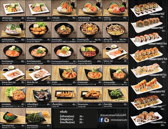 เมนูของที่ร้านก็มีหลากหลายมาก จะมีแบบซาชิมิ ซูชิแบบคำ ซูชิโรล ข้าวหน้าต่างๆ ของทานเล่น ยืมรูปจากเพจมานะคะ