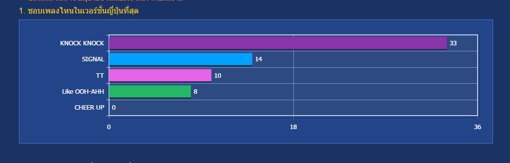 มีคนโหวต ทั้งหมด 65 คน จากแผนภูมิเลือกได้เพียงเพลงเดียว ดังนั้นสมาชิกในคลับเลือกให้เพลง KNOCK KNOCK ถูกหูต้องใจที่สุด รองลงมาคือ Signal ตามลำดับ มารอลุ้นกันต่อไปว่าเพลงไหนจะโดนใจแม่ปุ่นกัน จะชอบเหมือนเราไหม