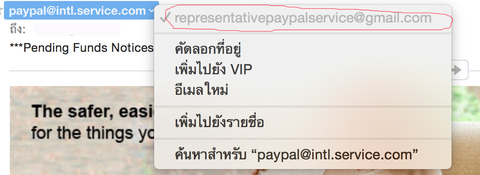 2. Email ที่ส่งมาไม่ได้ออกมาจาก Paypal แต่ออกมาจาก service.com เมื่อเข้าไปดูข้างในกลายเป็น gmail