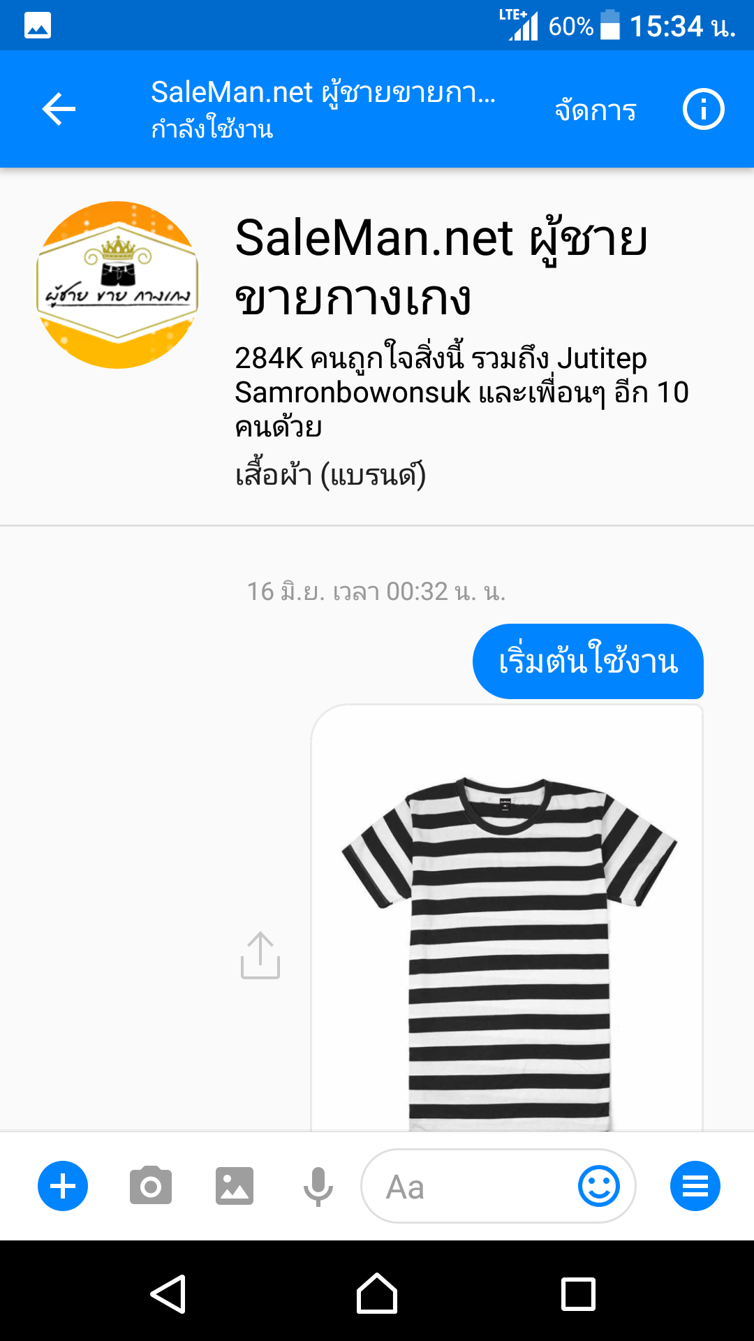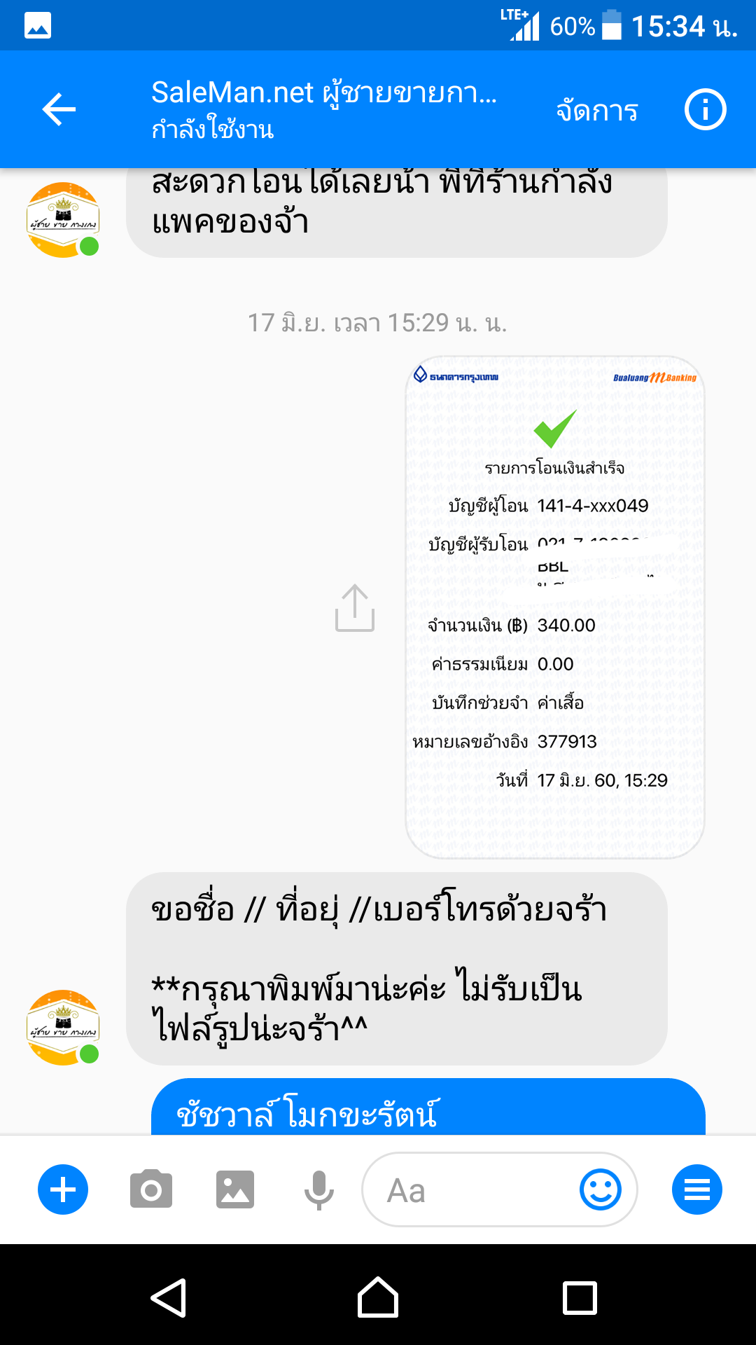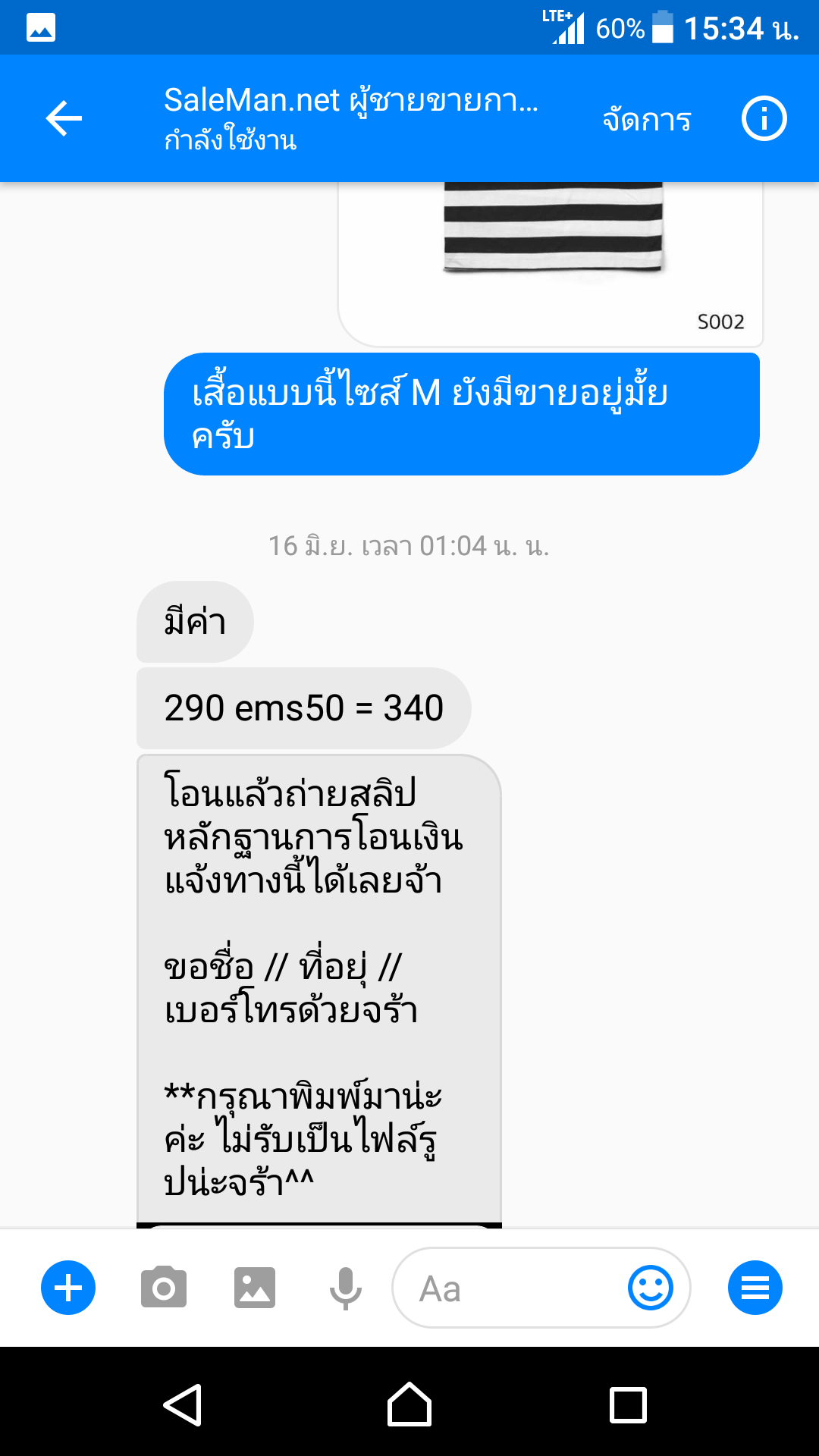เรื่องคือเมื่ออาทิตย์ก่อนผมได้ทำการสั่งซื้อเสื้อยืดตัวนึงจากเพจเพจนึงใน Facebook ในราคา 290 + ค่าส่งอีก 50 บาทเป็น 340 บาท จริงๆถ้าซื้อจากแบรนด์เลยจะสามารถซื้อในราคาราคาแค่ 150 แต่ผมได้ทักไปถามที่เพจก่อนแล้วสรุปว่าไม่มีไซส์ ผมเลยต้องมาซื้อกับร้านนี้ ถึงจะแพงกว่าเกือบเท่าตัวแต่ก็ยอมจ่ายถ้ามีของพร้อมส่งเลย(ปกติผมเป็นคนแบบนี้) เรื่องราคาผมไม่ซีเรียส