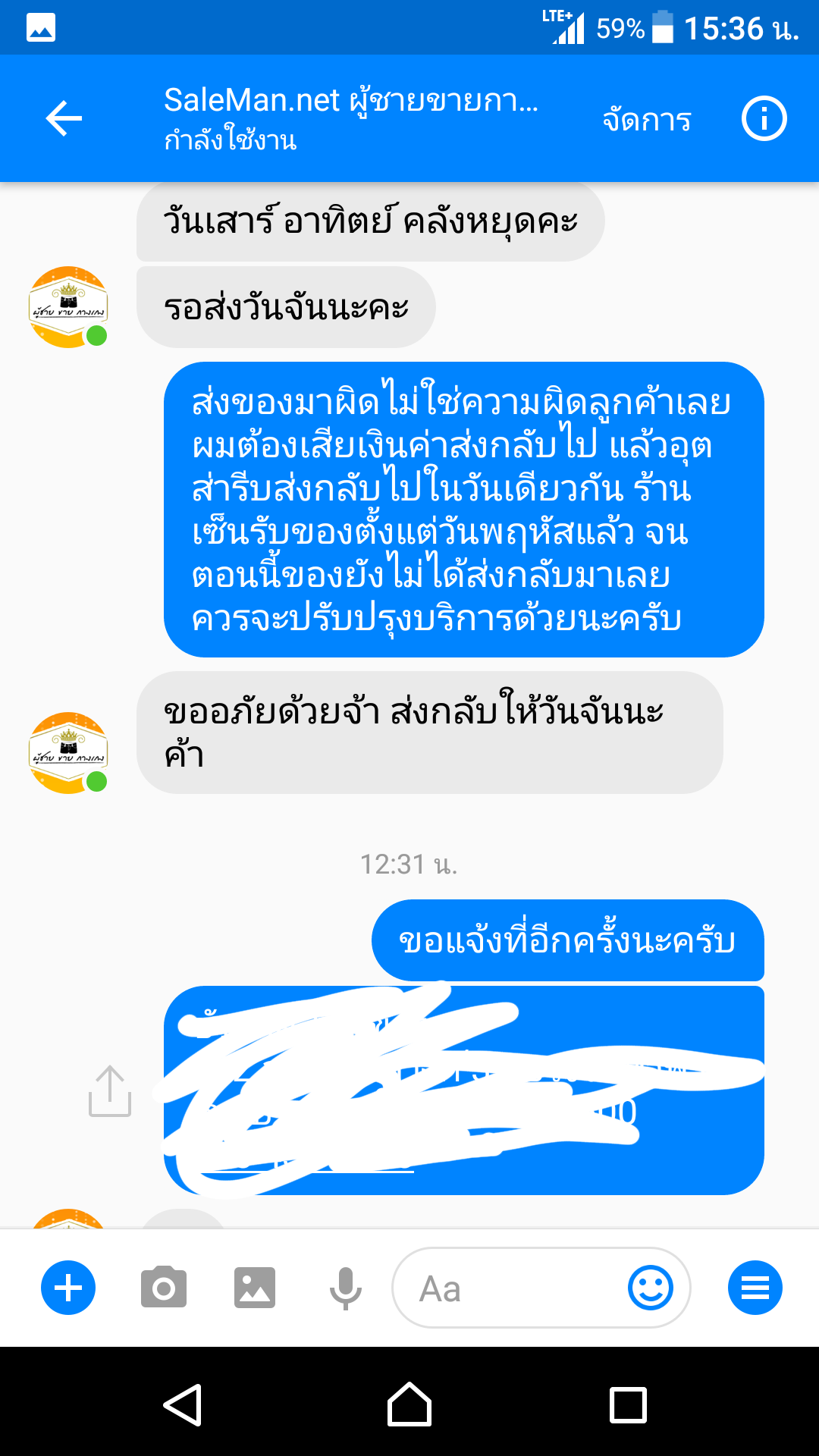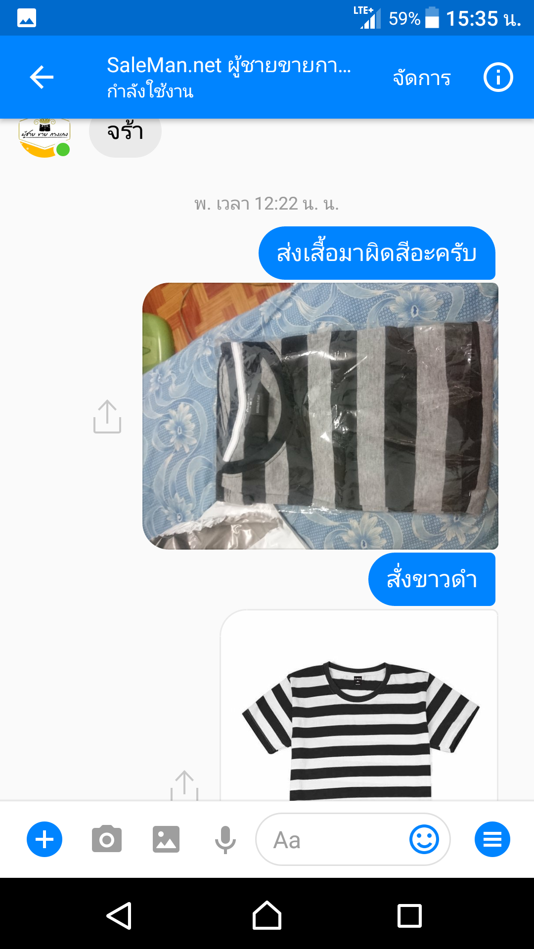 แต่ปัญหามันเริ่มหลังจากร้านส่งเสื้อตอนวันจันทร์ และมาถึงมือผมเมื่อวันพุธที่ผ่านเมื่อแกะห่อออกแล้วปรากฏว่ามันเป็นคนละตัวกับที่สั่ง ผมเลยรีบติดต่อกลับทางร้านโดยทันที และได้ทำการส่งเสื้อกลับไปเปลี่ยน(ค่าส่งผมออกเอง)