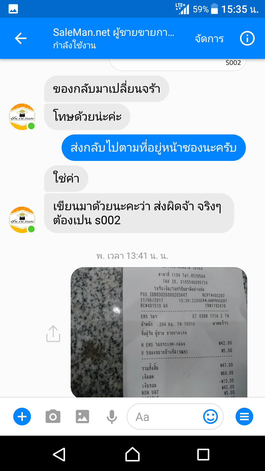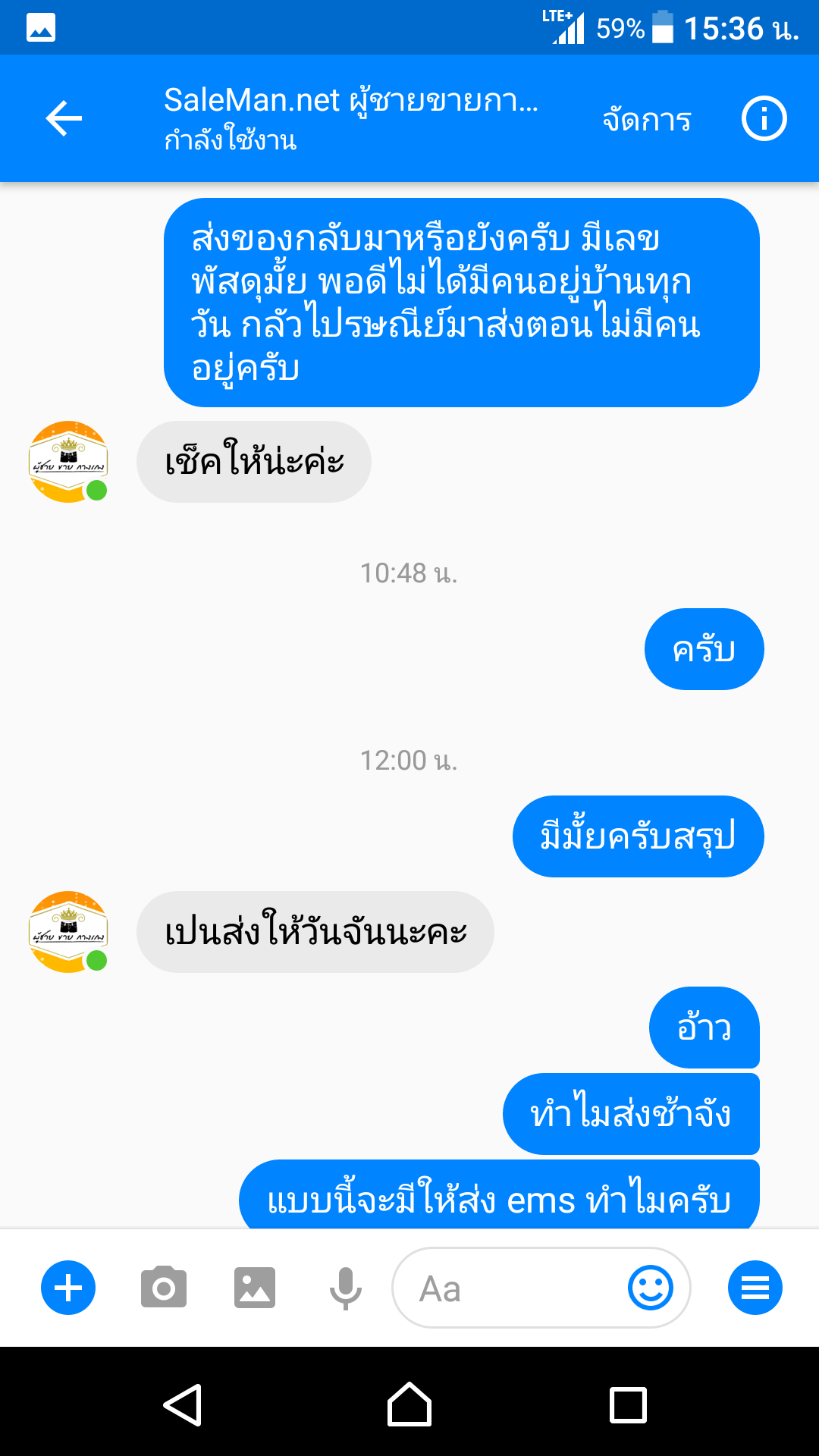 ถึงตรงนี้ผมยังไม่ค่อยซีเรียสเท่าไหร่ เช็คสถานะของดูร้านเซ็นรับตั้งแต่วันพฤหัสแล้ว จนมาถึงวันนี้ผมเลยทักไปคุยกับร้านอีกครั้งเพราะผ่านมาหลายวันแล้วอยากได้เลขพัสดุเพราะกลัวไปรษณีย์มาส่งแล้วไม่มีคนรับ ร้านบอกว่ายังไม่ได้ส่งจะส่งให้วันจันทร์(ถึงตรงนี้เริ่มเซ็งและเพราะเซ็นรับของไปตั้งแต่พฤหัส)