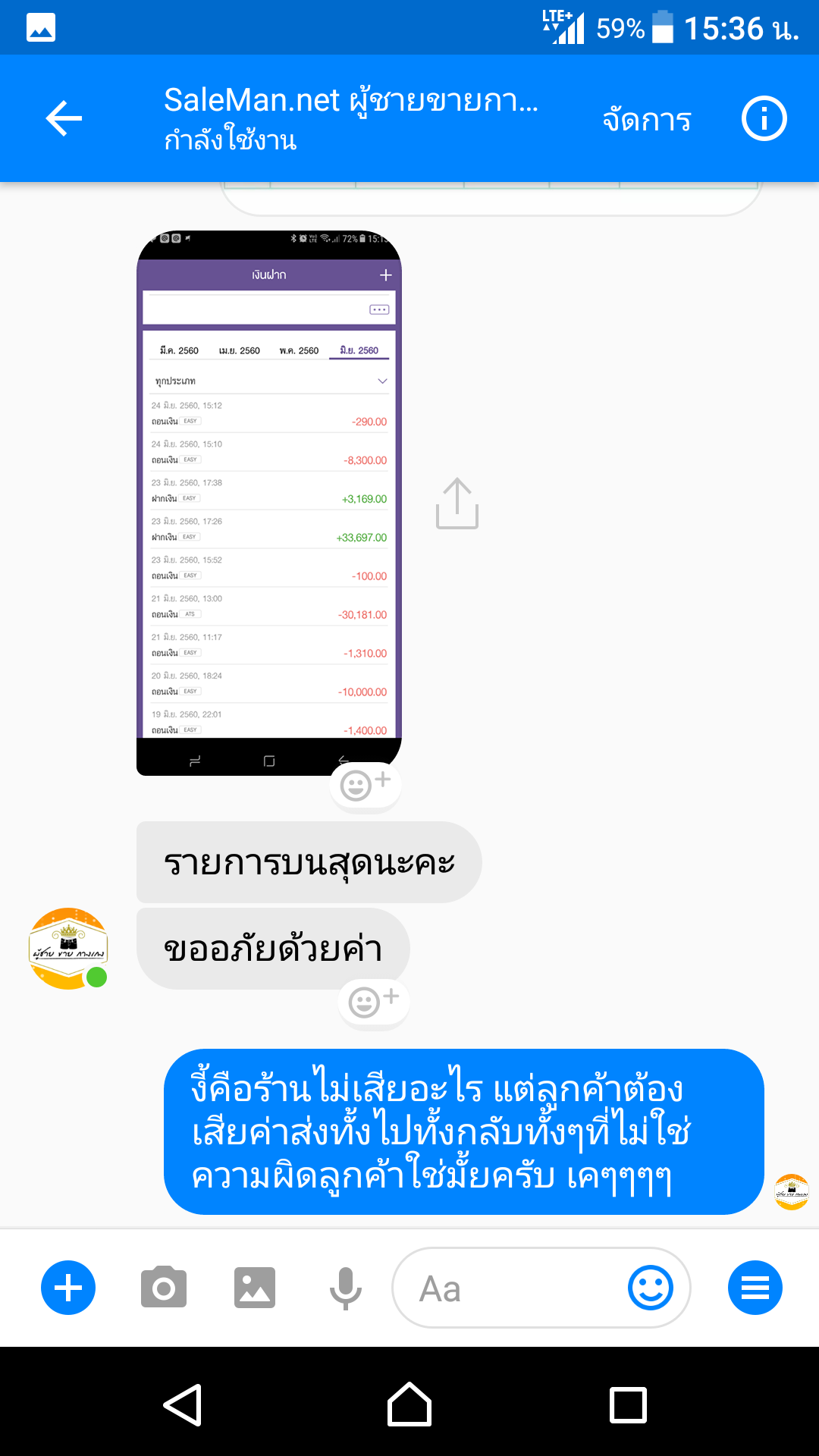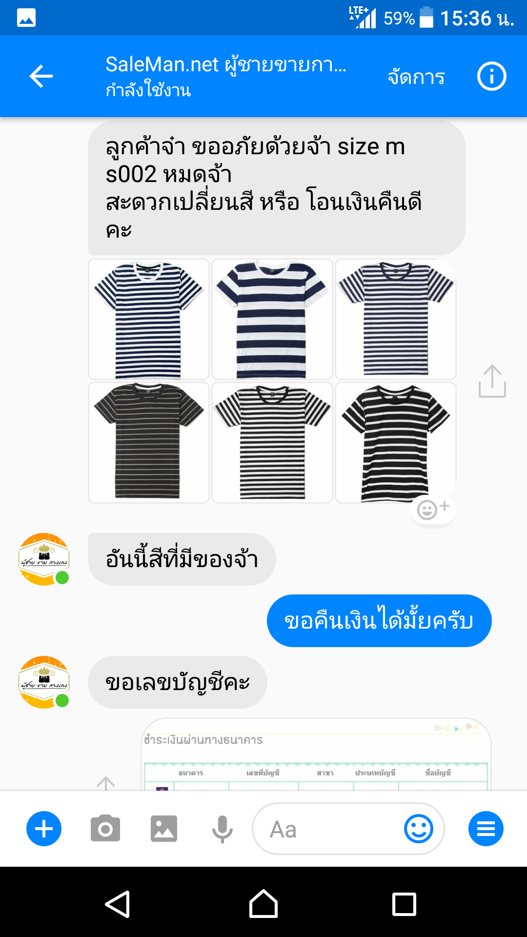 ไม่กี่ชั่วโมงต่อมาทางร้านทักมาบอกว่าเสื้อที่สั่งหมด(อ้าวเฮ้ย ไม่เหมือนที่คุยกันไว้ที่หว่า) และถามเราว่าจะรับเงินคืนหรือเปลี่ยนสินค้าดี ผมเลยขอเงินคืนดีกว่าเพราะเริ่มรู้สึกไม่โอเคแล้ว สุดท้ายร้านก็โอนเงินคืนมาให้เป็นจำนวน 290 บาท