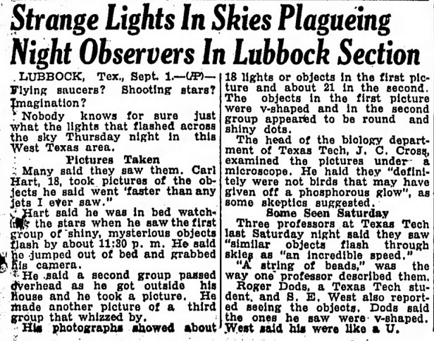 วันที่ 25 สิงหาคม 1951 (พ.ศ.2494) เวลา 3 ทุ่ม 10 นาที ด็อกเตอร์ ดับบลิว ไอ โรบินสัน, ศาสตราจารย์สอนวิชาธรณีวิทยาที่วิทยาลัยเทคนิกแห่งรัฐเท็กซัส ยืนอยู่ในสวนหลังบ้านของเขาซึ่งตั้งอยู่ในเมืองลับบอร์ค รัฐเท็กซัส กำลังพูดคุยกับเพื่อนผู้เป็นศาสตราจารย์ 2 คน คือ ดร. เอ จี โอเยิร์ก (Dr. A. G. Oberg) ศาสตราจารย์วิชาช่างกลเคมี และศาสตราจารย์ ดร.ดับบลิว แอล ดั๊คเคอร์หัวหน้าฝ่ายวิชาวิษวกรรมปิโตรเลี่ยม