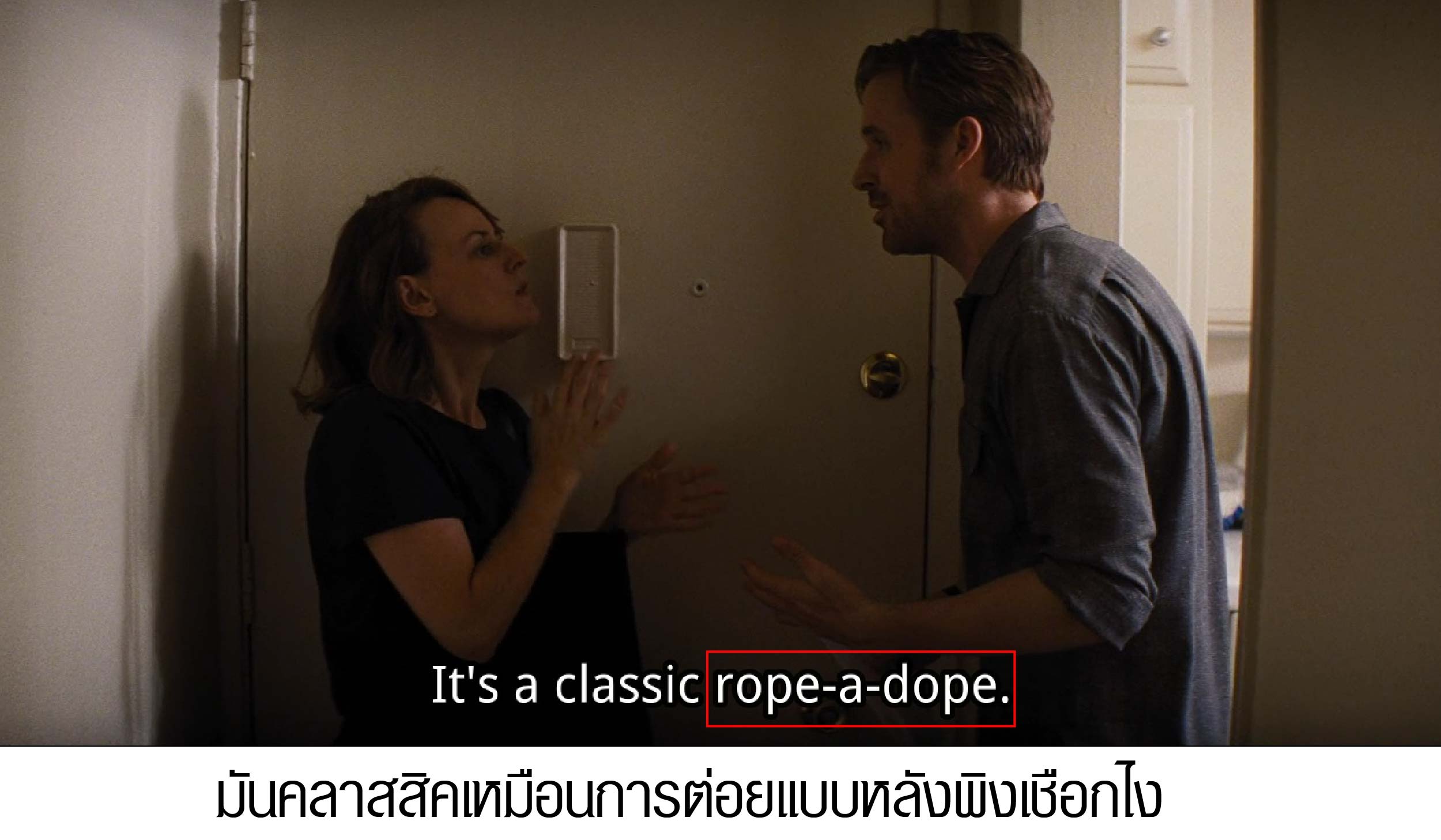 "Rope-a-dope" มีความหมายว่า "การชกมวยโดยเราแกล้งทำเหมือนสู้ไม่ได้ถอยไปจนหลังพิงเชือก แต่ที่จริงเป็นกลยุทธ์หลอกให้อีกฝ่ายหมดแรง เเล้วเราค่อยเอาคืน" ค่ะ