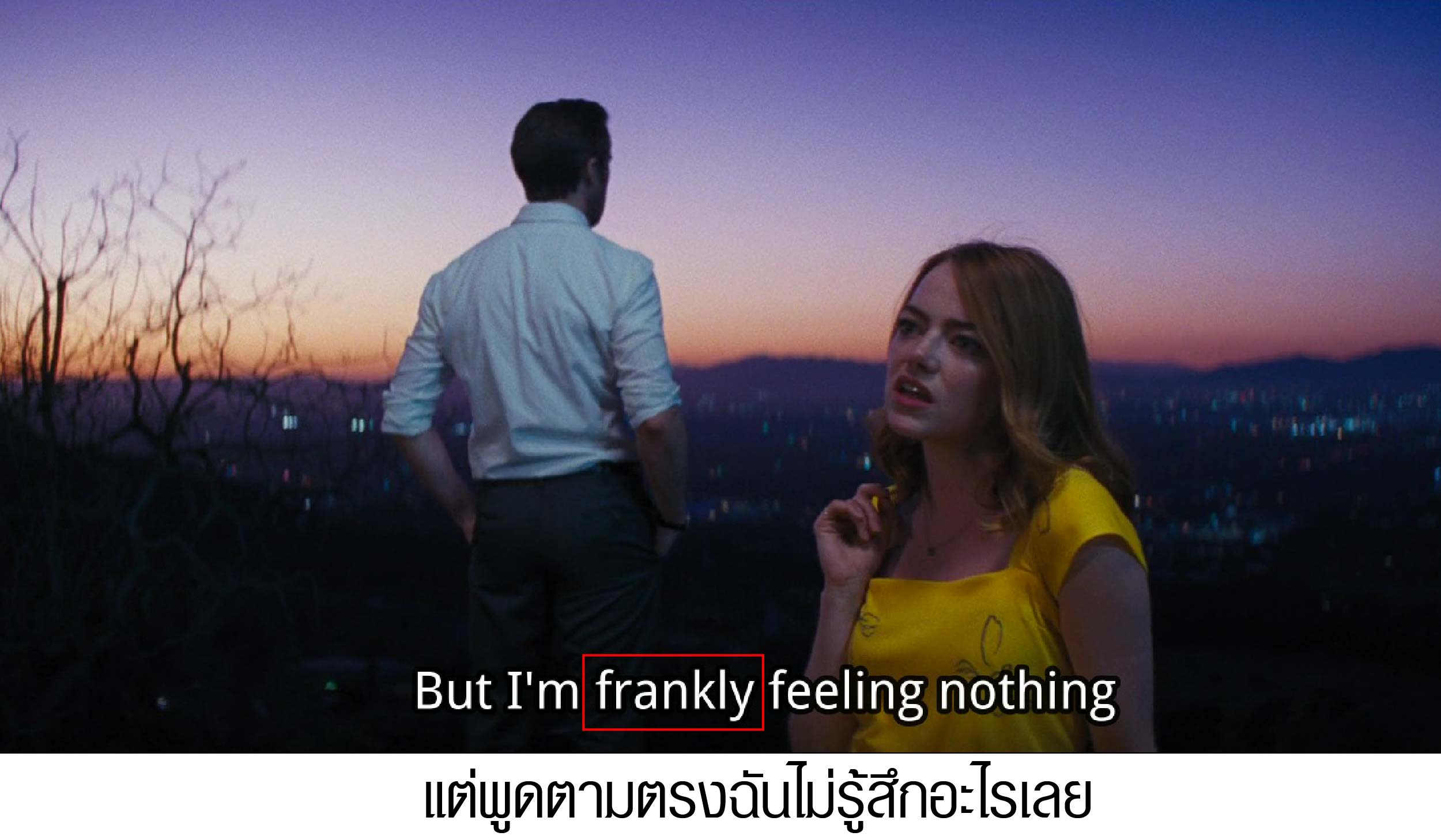 ในซีนนี้หลังจากมีอาพูดประมาณว่า วิวดี แต่ฉันไม่เห็นรู้สึกโรแมนติกอะไรเล้ย... เซบาสเตียนเลยหันขวับมาว่า ยังงั้นเหรอ?