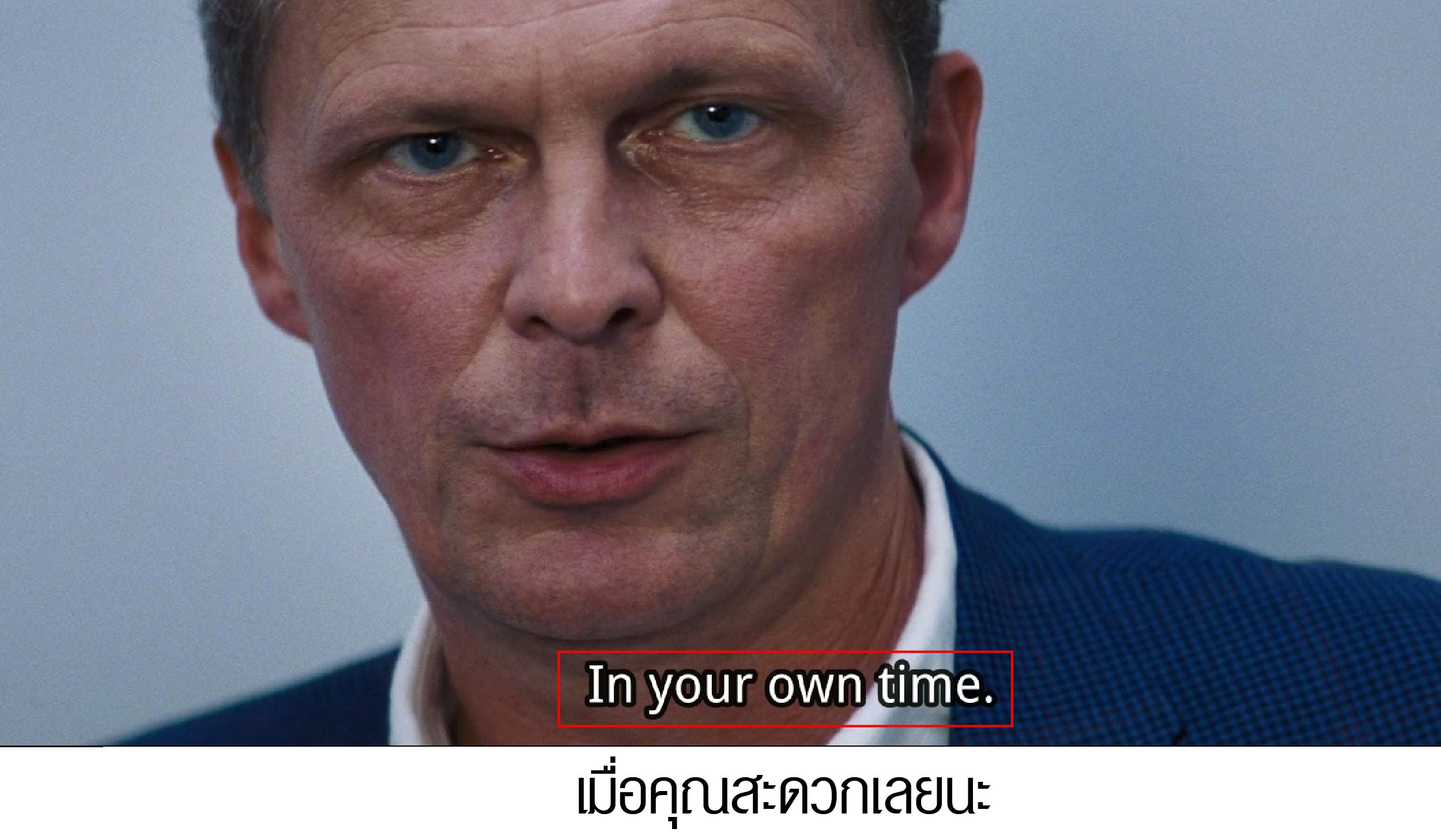 ในซีนนี้ มีอามาแคสติ้งบทนักแสดง เมื่อมีอาเข้ามายืนต่อหน้า ผู้ที่เป็นคนคัดเลือกเลยบอกมีอาว่า In your own time =เมื่อคุณสะดวกเลยนะ เมื่อพร้อมเเล้วมีอาก็เริ่มได้เลยนะ ทำนองนี้ค่ะ