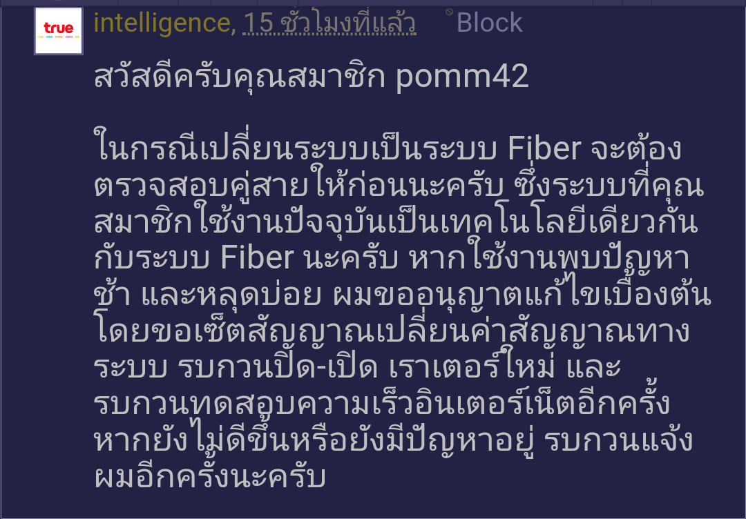ทั้งๆที่หมู่บ้านข้างหลังเกิดพร้อมๆกัน ของเค้าเป็น Fiber และ พอไปเช็คที่ทรูบอก "ปัจจุบันเป็น Fiber หมดแล้วนะคะคุณลูกค้า" เปิดคอมกดชื่อหมู่บ้าน "เออจริงคะยังเป็นเคเบิลอยู่เลย" หึหึ เ