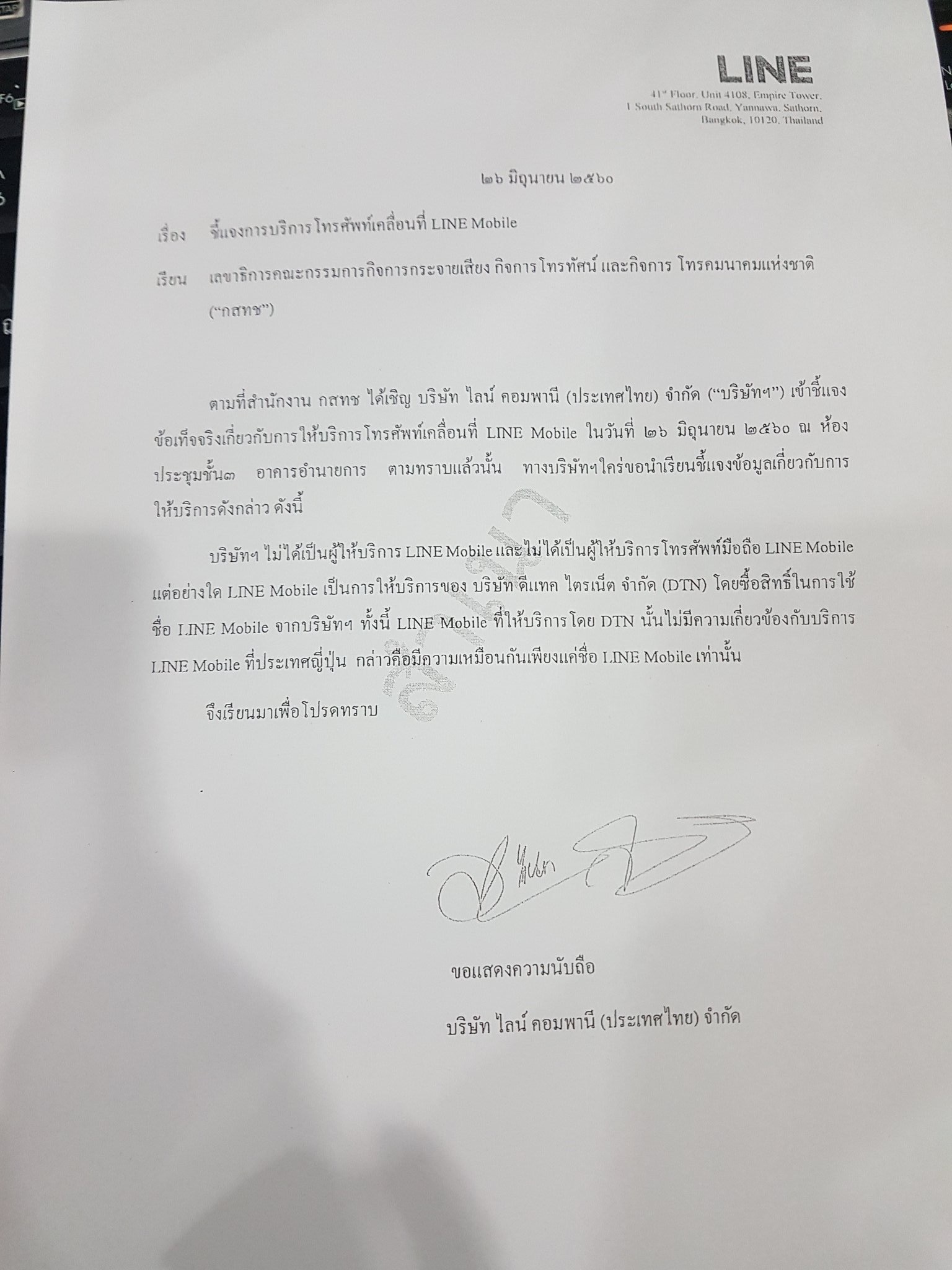 ไม่เกี่ยวกับ LINE! บ. LINE ประเทศไทย ส่งหนังสือ แจ้ง เลขาฯ กสทช. ยืนยัน ไม่ได้เป็นเป็นฝ่ายทำ"ไลน์โมบาย" แต่ Dtac ขอซื้อลิขสิทธิ์ไปทำเอง