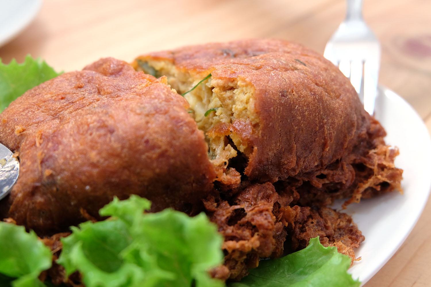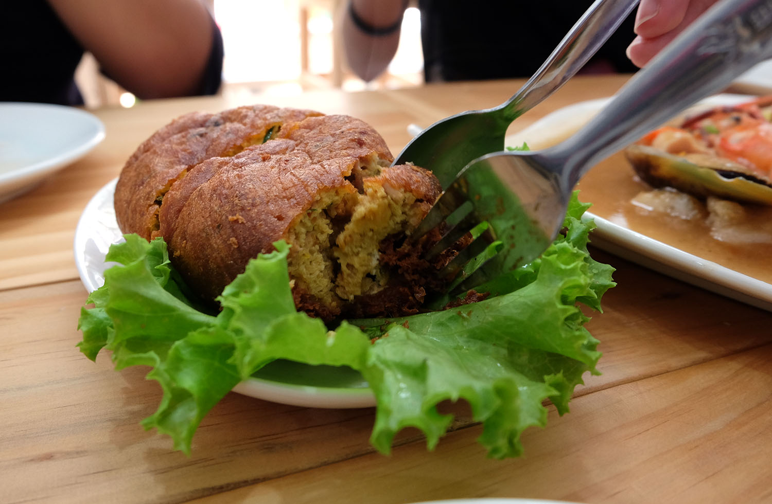 มันคือไข่เจียวผสมเครื่องแกงใต้ ใส่หมูสับ กุ้งสับ ทอดให้กลมฟูหนาๆ รสเผ็ดหน่อยๆกลิ่นหอมคล้ายห่อหมก