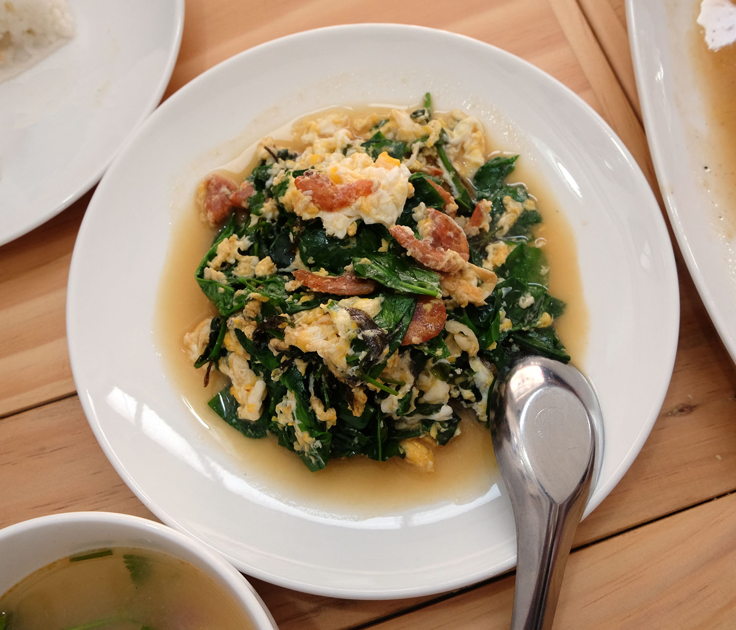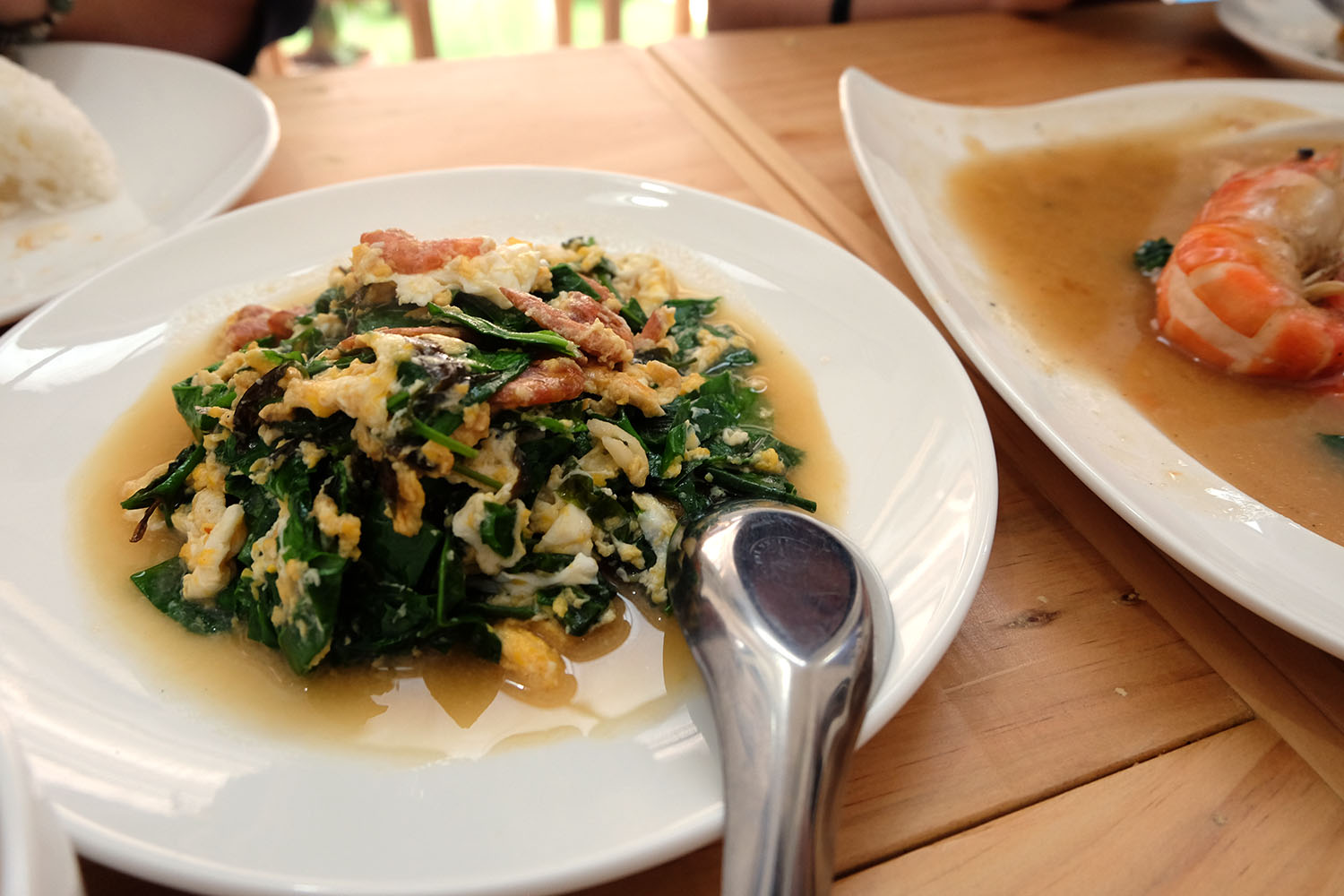 ใบเหลียงผัดไข่กุ้งเสียบ เอาจริงๆคือไม่รู้จักใบเหลียงอะ แต่เพื่อนบอกว่ามันมีความมัน เป็นผักพื้นบ้านของภาคใต้ ใครอยากลองรสชาติอาหารใต้แท้ๆ ขอเชิญค่ะ ใบไม้นี่เพื่อนส่งขึ้นมาจากใต้โดยเฉพาะ