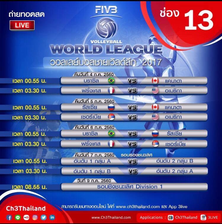 ตารางการถ่ายทอดสด Volleyball world league 2017 Division1 โดยช่อง 13