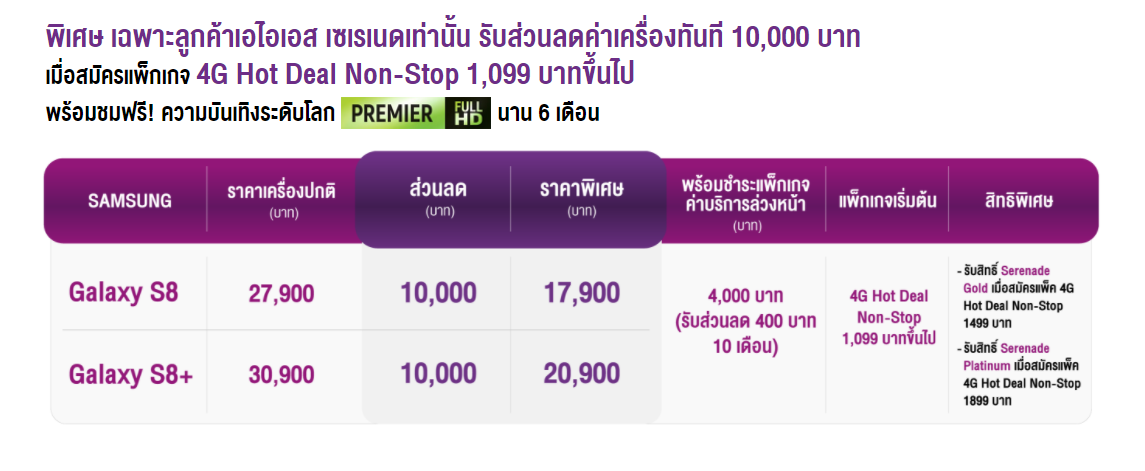 http://www.ais.co.th/samsung-galaxy-s8/serenade.html เท่าที่ผมเข้าใจคือถ้าจะลด 10000 บาทตั้งสมัครโปร 4G Hot Deal Non-Stop 1,099 บาทขึ้นไป อยากจะถามว่าผมสามารถสมัครโปรอื่นที่ราคา 1099 บาทแทนได้ไหมที่