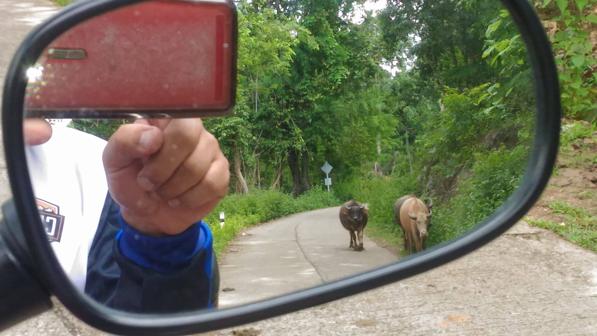 ระหว่างที่ผมก่มองไปที่ควาย และควายก็มองมาที่ควาย เอ๊ย! มองมาที่ผม ผมก็เหลือบไปเห็นเพื่อนของเจ้าถิ่นตรงปรี่มาที่ผมอีกสามตัวครับ มันอาจสงสัยว่าไอ้หมอนี่มันมาทำอะไรเพื่อนตรูหรือเปล่าอะไรทำนองนั้น เดินเข้ามาอย่างเร็วครับ ..ตัวผมเองก่ใช่จะกลัวนะแต่ก็รีบเก็บโทรศัพท์แล้วบึ่งรถออกมาแทบไม่ทันนะ 555 เกือบโดนเจ้าถิ่นสั่งสอนเสียแล้วเรา 555