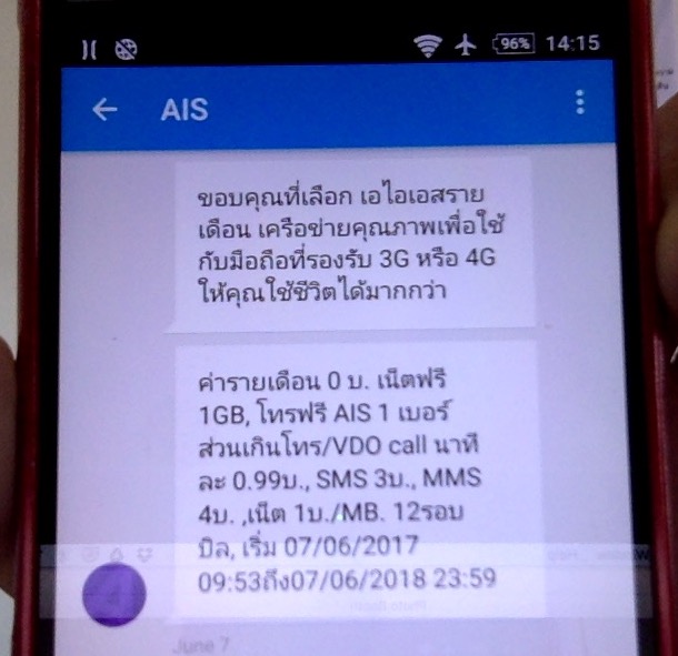 ผมเป็นสมาชิก AIS Fibre อยู่ครับ วันหนึ่งมี sim จาก AIS ส่งมาที่บ้านแจ้งว่าให้ใช้ฟรี 1 ปี เน็ตฟรี 1GB โทรนาทีละ 0.99 หากสนใจก็ให้ยืนยัน ผมจึงยืนยันเปิดใช้งานในวันที่ 7 กค 60