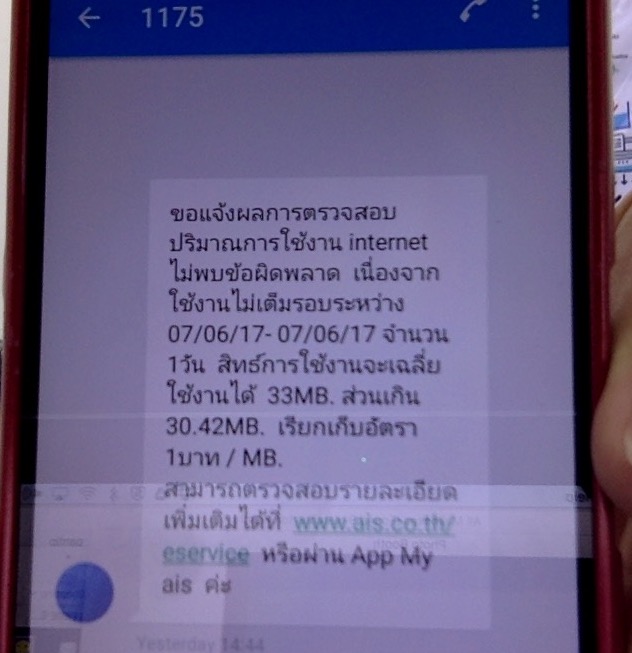 แต่ปัญหาเกิดเมื่อผมพบข้อความจาก AIS ว่าผมใช้เน็ตเกินและจะถูกเก็บค่าบริการ