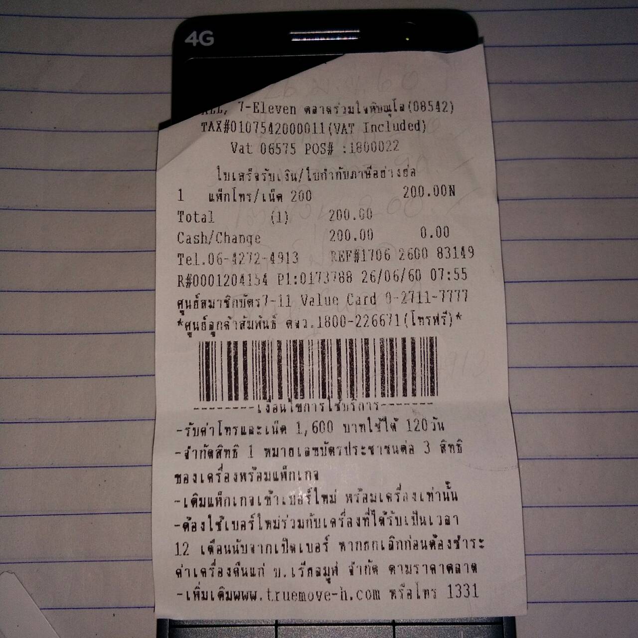 ในตอนท้ายของใบเสร็จเติมเงินค่าแพ็กเกจ 200 บาท(รูปที่3) ระบุว่าต้องใช้เบอร์นี้ร่วมกับเครื่อง-