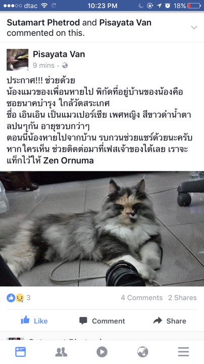 ประกาศแมวหายครับ ใครพบเห็นช่วยแจ้งด้วยนะครับ