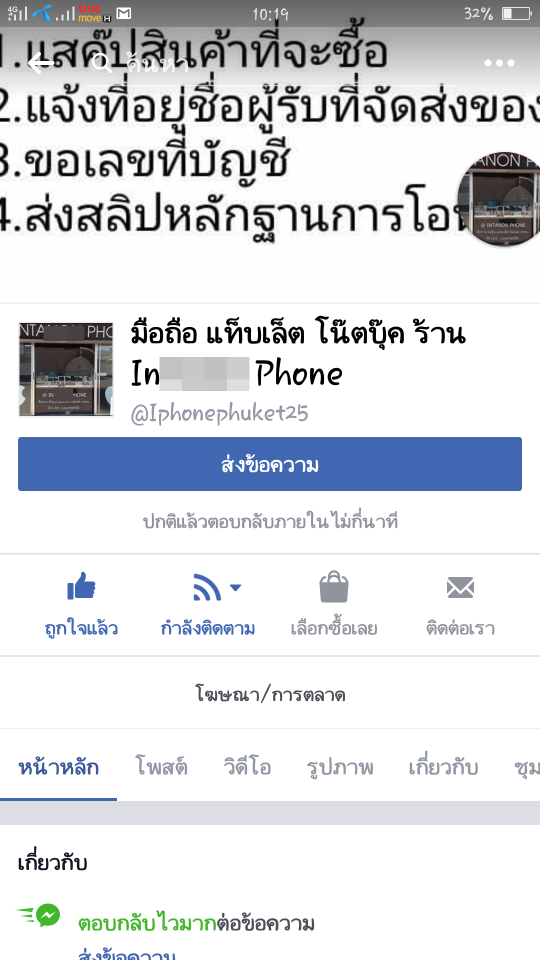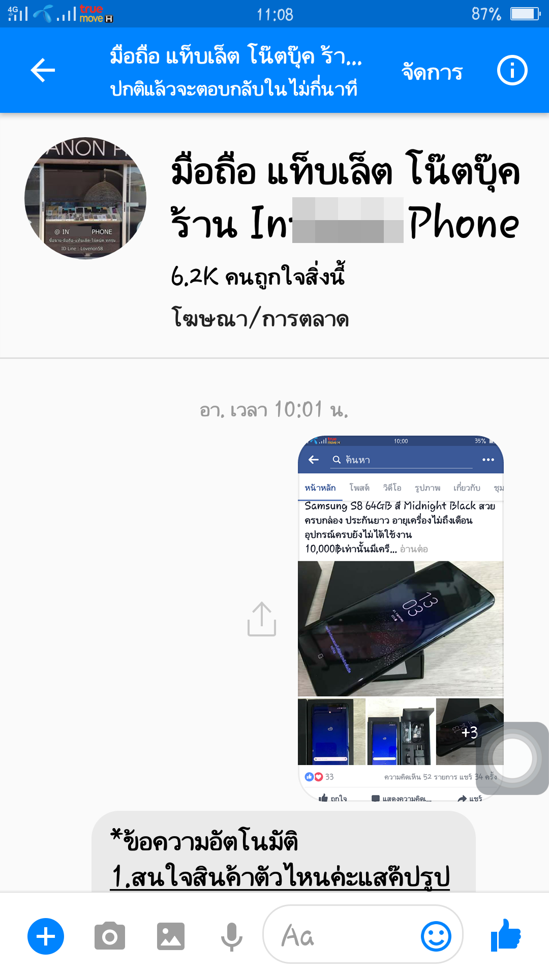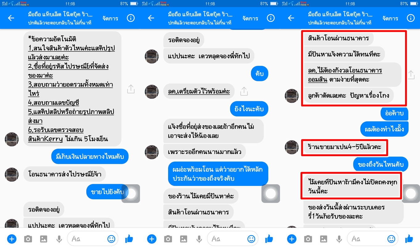 ทำให้ผมรู้สึกว่าสมัยนี้น่าจะมีการรัดกุมในเรื่องกฎหมาย พรบ. คอมพิวเตอร์ เข้มงวด สามารถติดตามตัวคนร้ายได้หากมีคดีฉ่อโกง บวกกับอาการพึ่งตื่นแต่เช้าเลยไม่ได้สติในการตรวจสอบข้อมูลให้ละเอียดก่อน (หากผู้อ่านจะว่าผมโง่ก็น้อมรับครับ มีความประมาทเลินเล่อเข้าแล้ว) ....ผมก็ยังตัดสินใจทัก IB ส่วนตัวไปหาเจ้าของร้านเพื่อสอบถามสินค้า และผู้หญิง (ใช้คำลงท้ายว่า ค่ะ ในการสนทนา) เป็นคนตอบแชทครับ...
