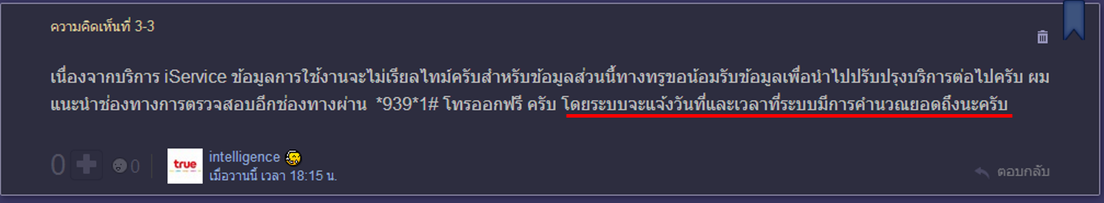 - CC. แจ้งว่า True i-service ยังเป็นข้อมูลที่ไม่ เรียลไทม์ ให้เช็คกับ *939*1# จะเป็นข้อมูลที่ถูกต้องตรงกับวันที่และเวลาที่เช็คตามรูปด้านล่าง