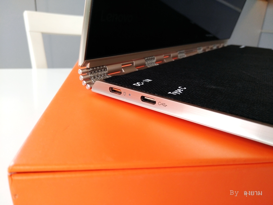 ด้านขวา จะมีช่อง USB และช่องเสียบหูฟังขนาด 3.5 มม. และก็ปุ่ม POWER ความสามารถพิเศษของ Lenovo YOGA 910 อีกเรื่องคือ ช่อง USB มาพร้อมกับฟังก์ชั่น Always-On Charging มันสามารถชาร์ทแบตให้อุปกรณ์อื่นได้ แม้เครื่องจะปิดอยู่ ทำหน้าที่เหมือนเป็น power bank ให้กับอุปกรณ์ชิ้นอื่นๆได้ ฟังก์ชั่นนี้ สามารถเปิดหรือปิดการใช้งานได้