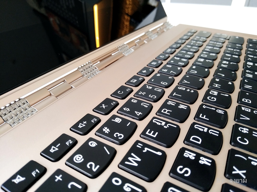 คีย์บอร์ดของ Lenovo YOGA 910 เป็นแบบแยกปุ่มกด มีช่องว่างระหว่างปุ่มให้ ตัวปุ่มคีย์บอร์ดมีความโค้งมนตามสรีระของนิ้วมือเวลาใช้งาน ระยะในการกดปุ่ม ปกติของ ultrabook ปุ่มกดนุ่มและระยะกดสั้น