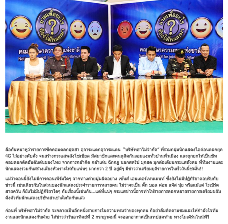 ใครเป็นแฟนรายการ บ. ฮาไม่จำกัด บ้างครับ เพิ่งเห็นข่าวลือจากในเนตมาว่าจะไม่มีรายการแล้ว