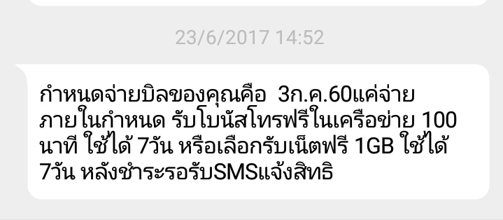 มีข้อความแจ้งเตือนค่าโทรศัพท์ แล้วผมก็จ่ายตามกำหนด แต่ไม่เห็นได้ข้อความแจ้งรับเน็ตฟรี หรือโทรฟรีเลยครับ ก่อนหน้านี้ก็ยังได้รับ แต่สองสามเดือนหลังนี้ไม่มีให้แล้ว แค่อยากบอกว่า ทีหลังไม่ต้องแจ้งว่าถ้าจ่ายภายในกำหนดจะได้รับโน่น นี่ นั่นก็ได้ครับ