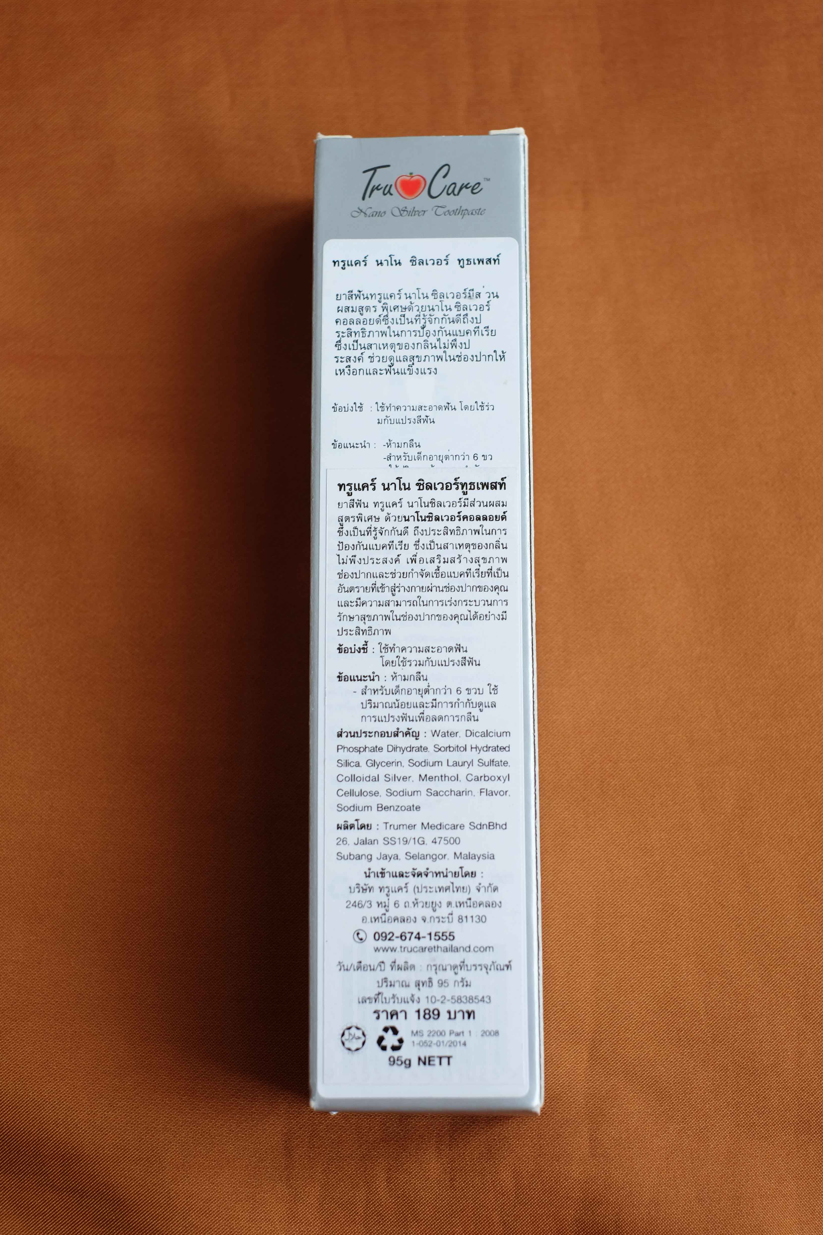 รูปนี้เป็นส่วนด้านหลังกล่องยาสีฟันทรูแคร์มีคำอธิบาย สรรพคุณ ส่วนประกอบ และอื่นๆ