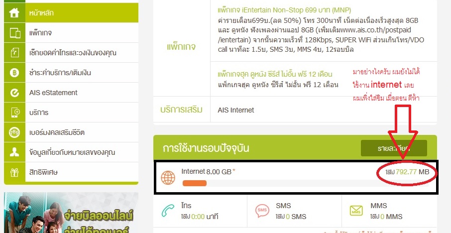 ผมได้เข้าไปเช็คหน้า web service ของ AIS พบว่า มียอดการใช้งาน internet 792.77 MB