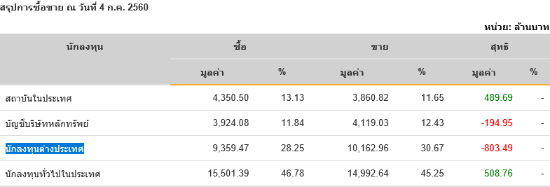 Sinthorn Summary 4/7/2560 : ต่างชาติขายสุทธิ -803.49 ลบ.