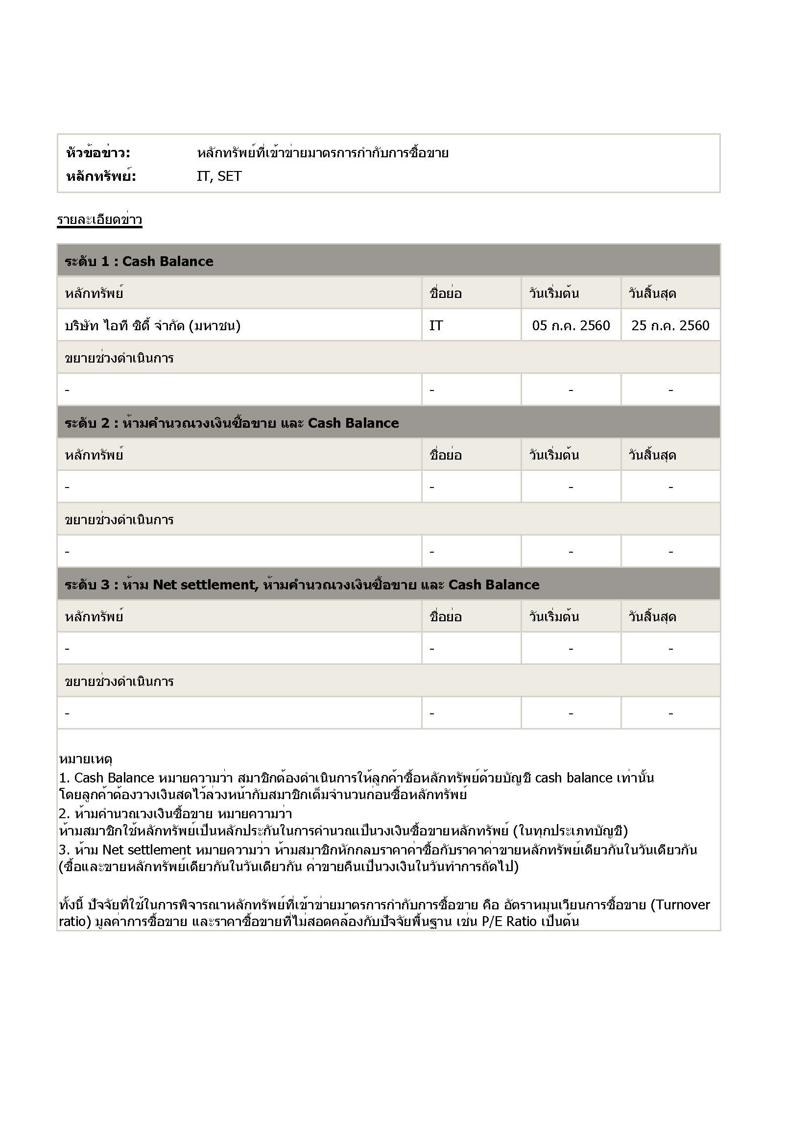 CASH BALANCE : ตลท ประกาศหลังปิดตลาด 17/2/2560 หลักกูเท่านั้น