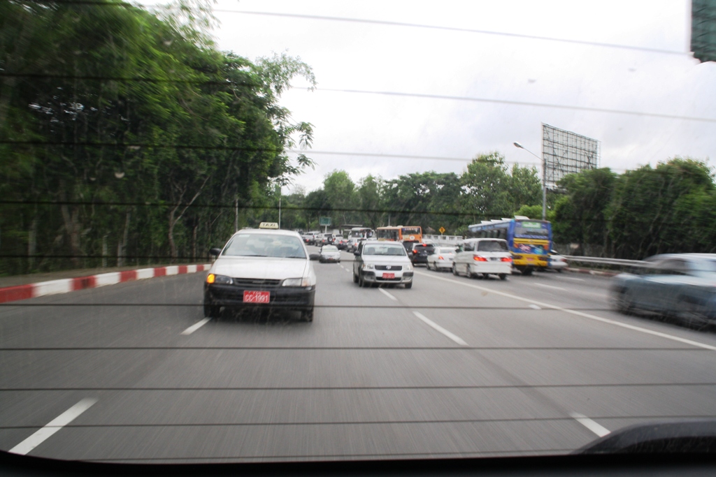 เส้นทางมุ่งเข้าสู่ตัวเมือง ย่างกุ้ง มีอะไรให้ตื่นเต้นสนุกสนานตลอดการเดินทาง เพราะรถยนต์พม่าพวงมาลัยอยู่ทางขวาเหมือนบ้านเราแต่ที่แปลกคือว่ารถเขาก็วิ่งทางขวานี่สิ เวลาจะแซงแต่ละทีเขาต้องแซงทางซ้ายคนที่นั่งทางซ้ายจะเห็นรถที่ส่วนทางมาก่อนที่คนขับจะเห็น มันตื่นเต้นดีแต่คนขับเขาชำนาญ