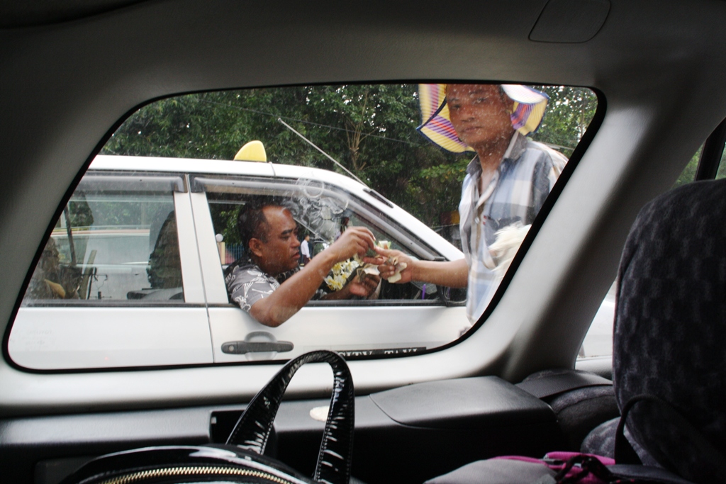 ตามแยกบ้านเราจะขายพวงมาลัย แต่ที่เห็นในภาพเขาขายหมากกันค่ะ