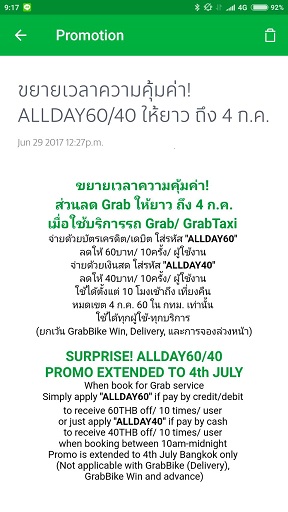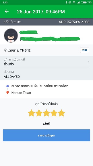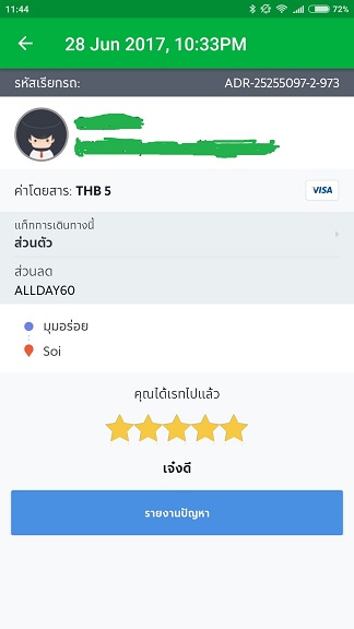 แต่ระบบ Grabpay ได้หักค่าโดยสารรวมส่วนลดไปก่อน 72 บาท โดยทาง call center แจ้งว่าจะคืนส่วนลด 60 บาทกลับเข้าบัตรให้ภายใน 7 วัน
