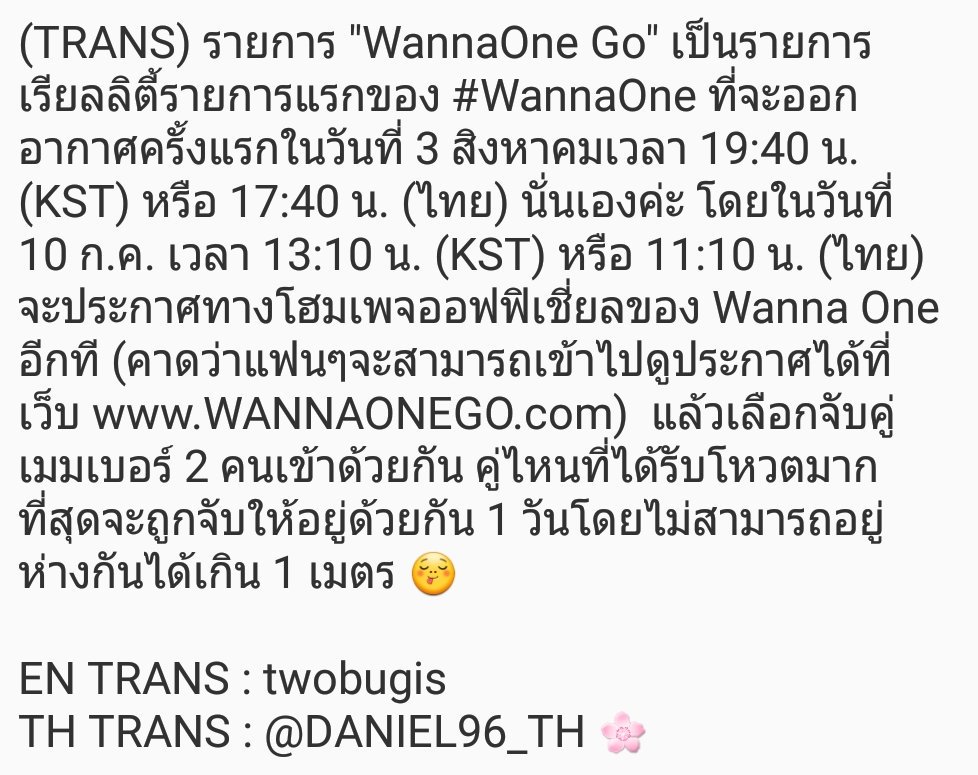 --- :)พรุ่งนี้--- พรุ่งนี้รายการ Wanna One Go ตอนแรก ออกอากาศเวลา 17.40 (ไทย) รับชมผ่านทีวีและสตรีม จะมีการเปิดเผยเพลงเดบิวในรายการ / " MnetออกมายืนยันเวลาออกอากาศของWanna One Goแล้วนะคะ สามารถ