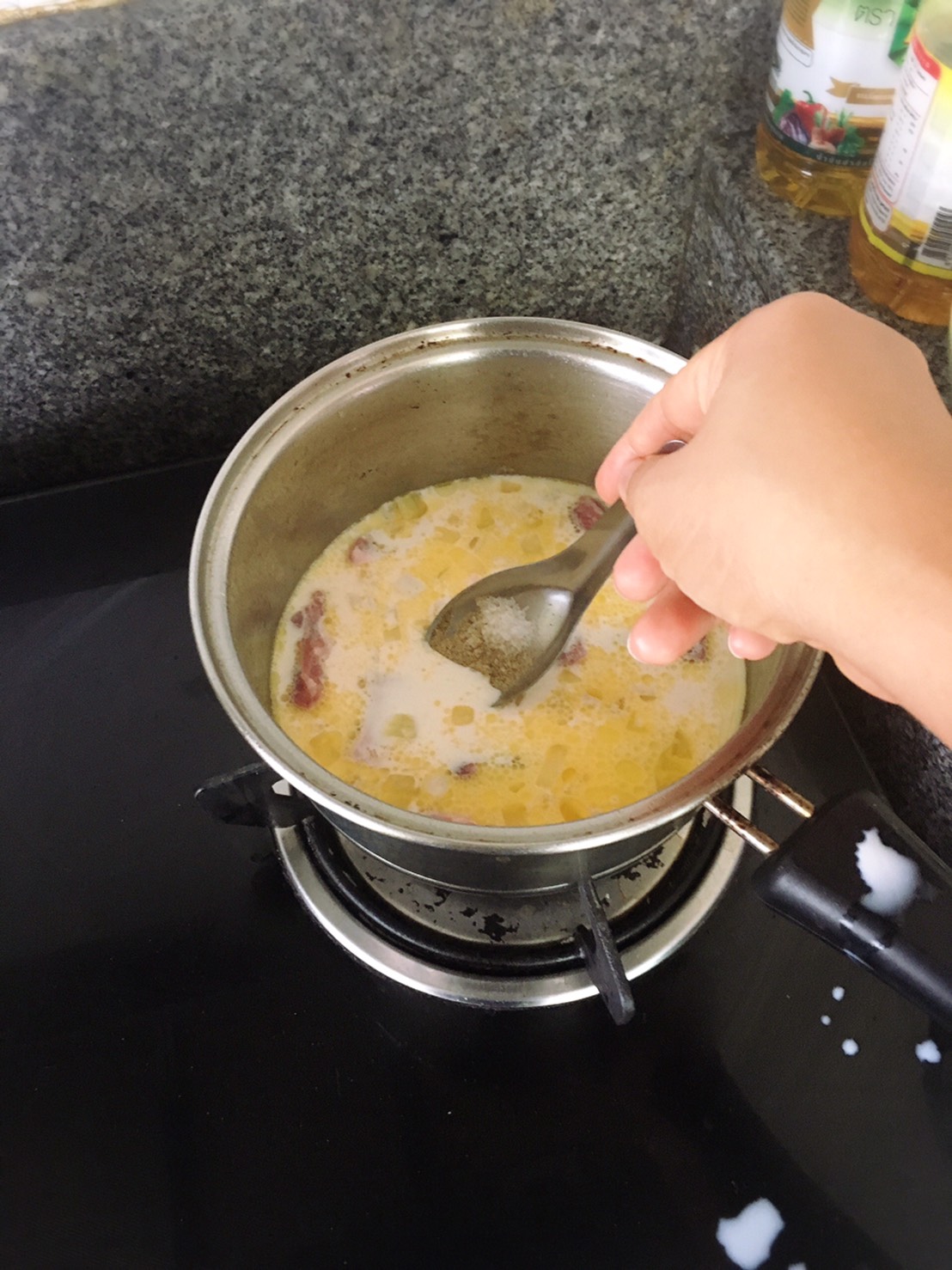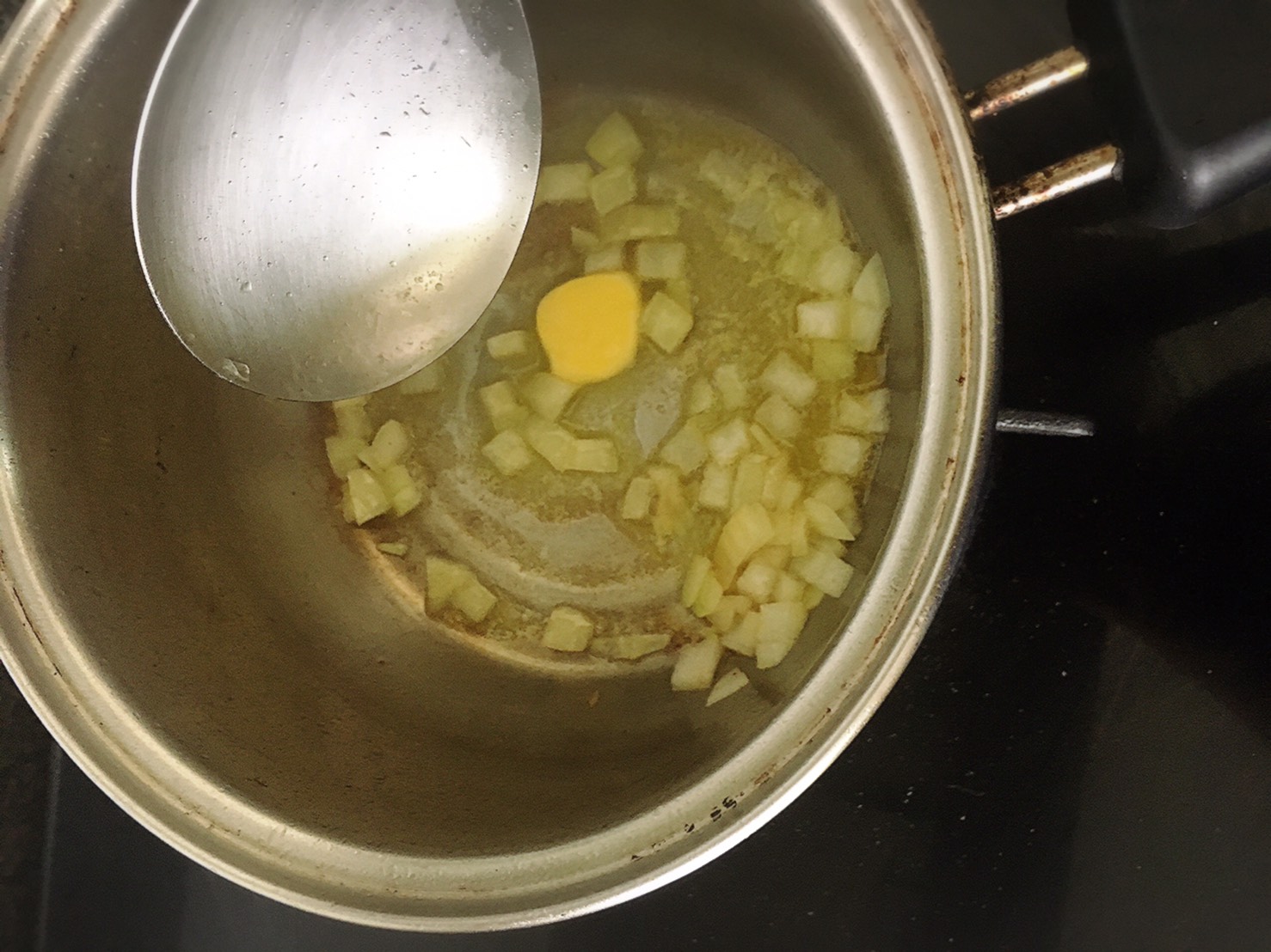 3. เตรียมวัตถุดิบครบแล้ว ก็ตั้งเปิดเตาตั้งหม้อเลย ใส่เนยจืดลงไป ให้ละลายทั่วๆหม้อ แล้วตามด้วยหอมใหญ่ ผัดให้หอมๆค่ะ