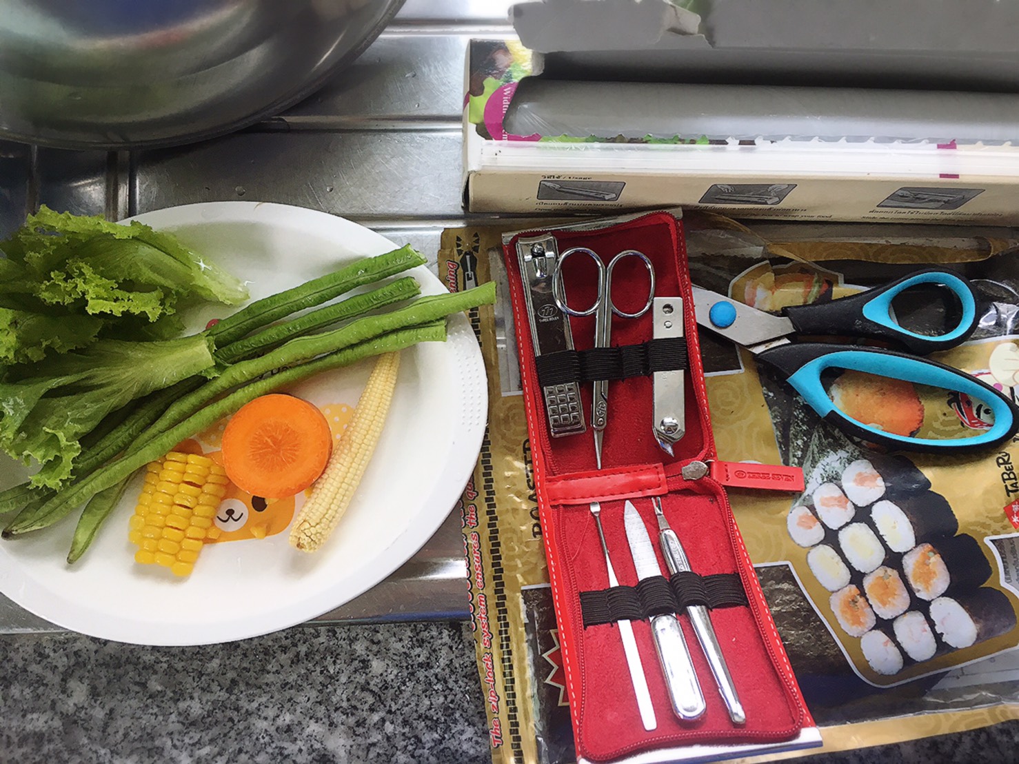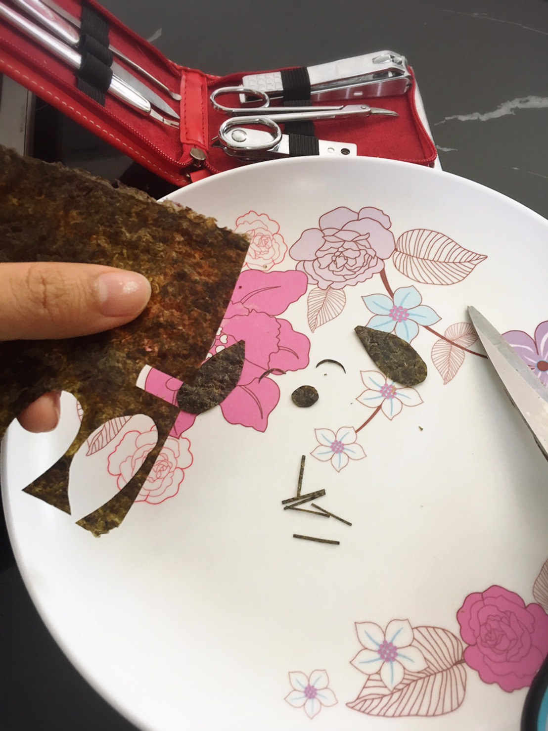 จากนั้นเราก็มาตัดแผ่นสาหร่ายค่ะ ทำเป็นตา จมูก หู เราใช้กรรไกรอันเล็กๆ ตัดง่ายดีค่ะ หูชิ้นใหญ่ๆก็ใช้กรรไกนอันใหญ่เอา กรรไกรตรงนี้ใช้สำหรับทำอาหารเท่านั้นนะคะ