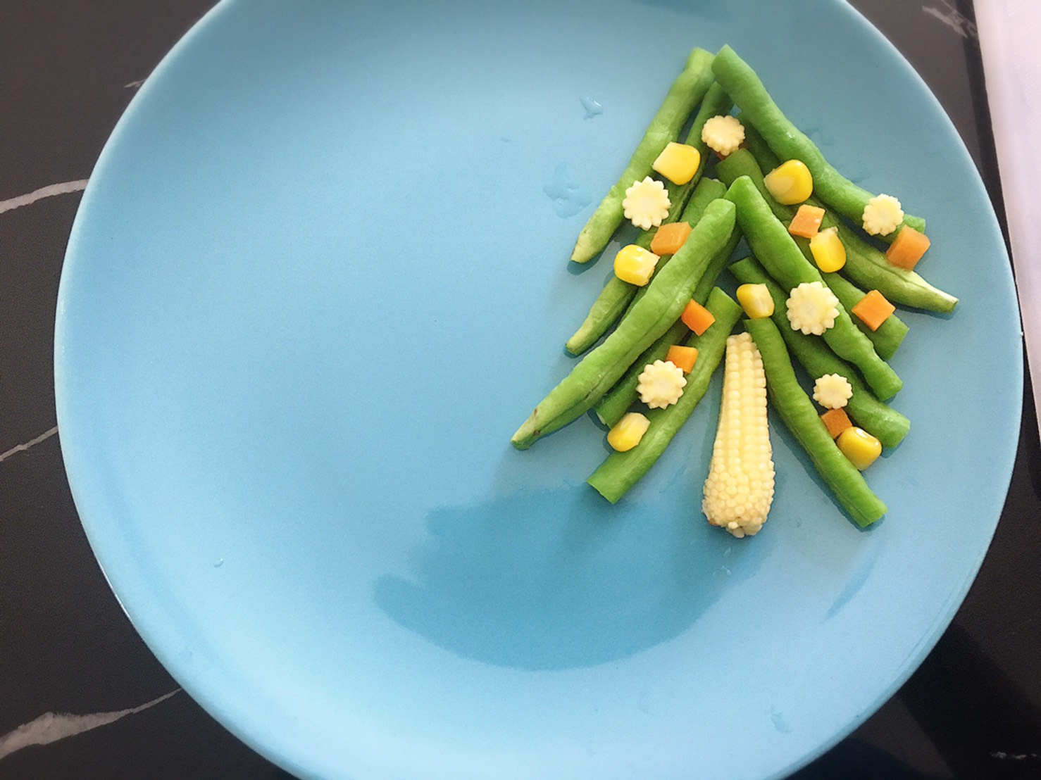 แล้วก็หั่น ข้าวโพดอ่อน แครอท ข้าวโพด มาวางให้เป็นเหมือนตกแต่งต้นคริสต์มาส อ่ะ เริ่มสวยแล้วใช้ไหมคะ
