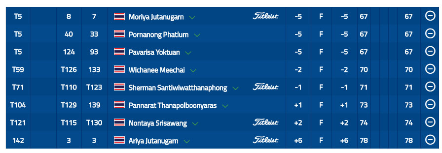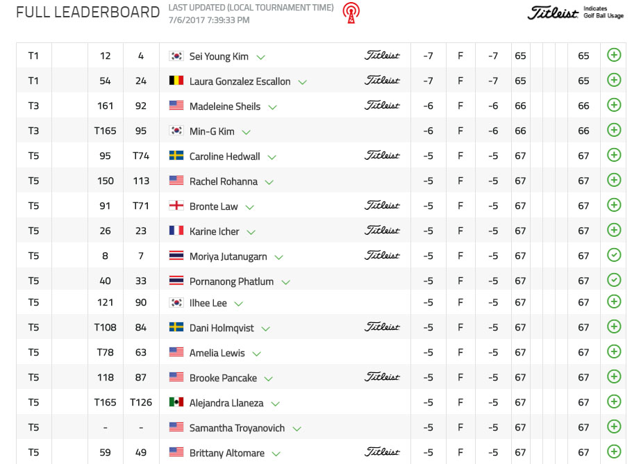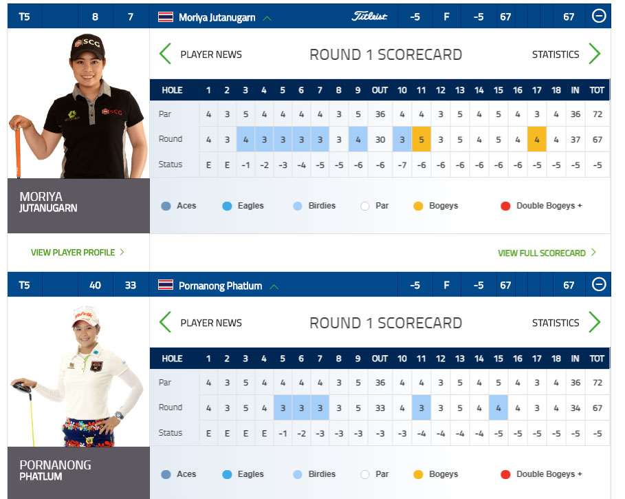 ส่วนผู้นำก็ยังไปไม่ไกลครับ ยังพอไล่ทัน อันที่จริงเมื่อคืนน้องโมน่าจะขึ้นนำเดี่ยวแล้ว ถ้าไม่เสียโบกี้ซะก่อน สกอร์ผู้นำ