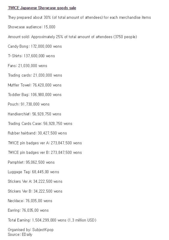 TWICE ขายสินค้าหน้างานโชว์เคสที่ญี่ปุ่นเป็นจำนวนเงินกว่า 1.5พันล้านวอนหรือ44ล้านบาท