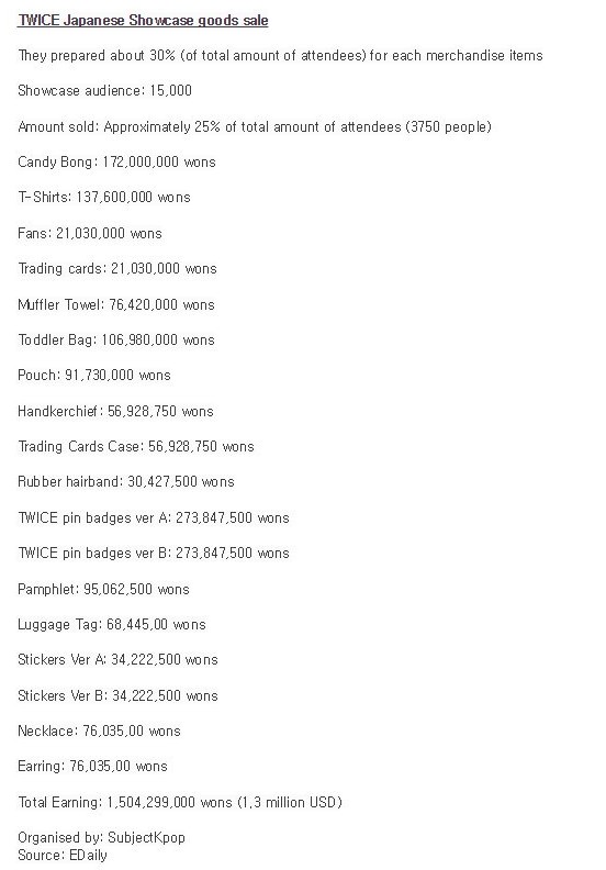 TWICE ขายสินค้าได้อย่างน้อย 1.5 พันล้านวอน (44ล้านบาท) ในวันโชว์เคสที่ญี่ปุ่น