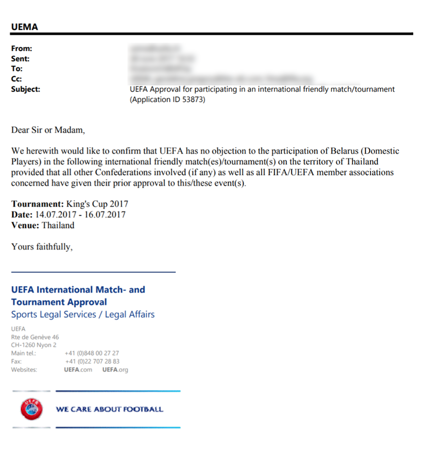 สมาพันธ์ฟุตบอลยุโรป(UEFA) ส่งหนังสือยืนยันมาถึงสมาคมกีฬาฟุตบอลแห่งประเทศไทย ว่าไม่คัดค้านกรณีสมาคมฟุตบอลเบลารุสส่งทีมชาติที่ใช้ผู้เล่นจากลีกในประเทศทั้งหมดมาร่วมการแข่งขันฟุตบอลชิงถ้วยพระราชทานคิงส์คัพ เนื่องจากไม่สามารถเรียกตัวผู้เล่นที่มีต้นสังกัดอยู่ในต่างประเทศได้